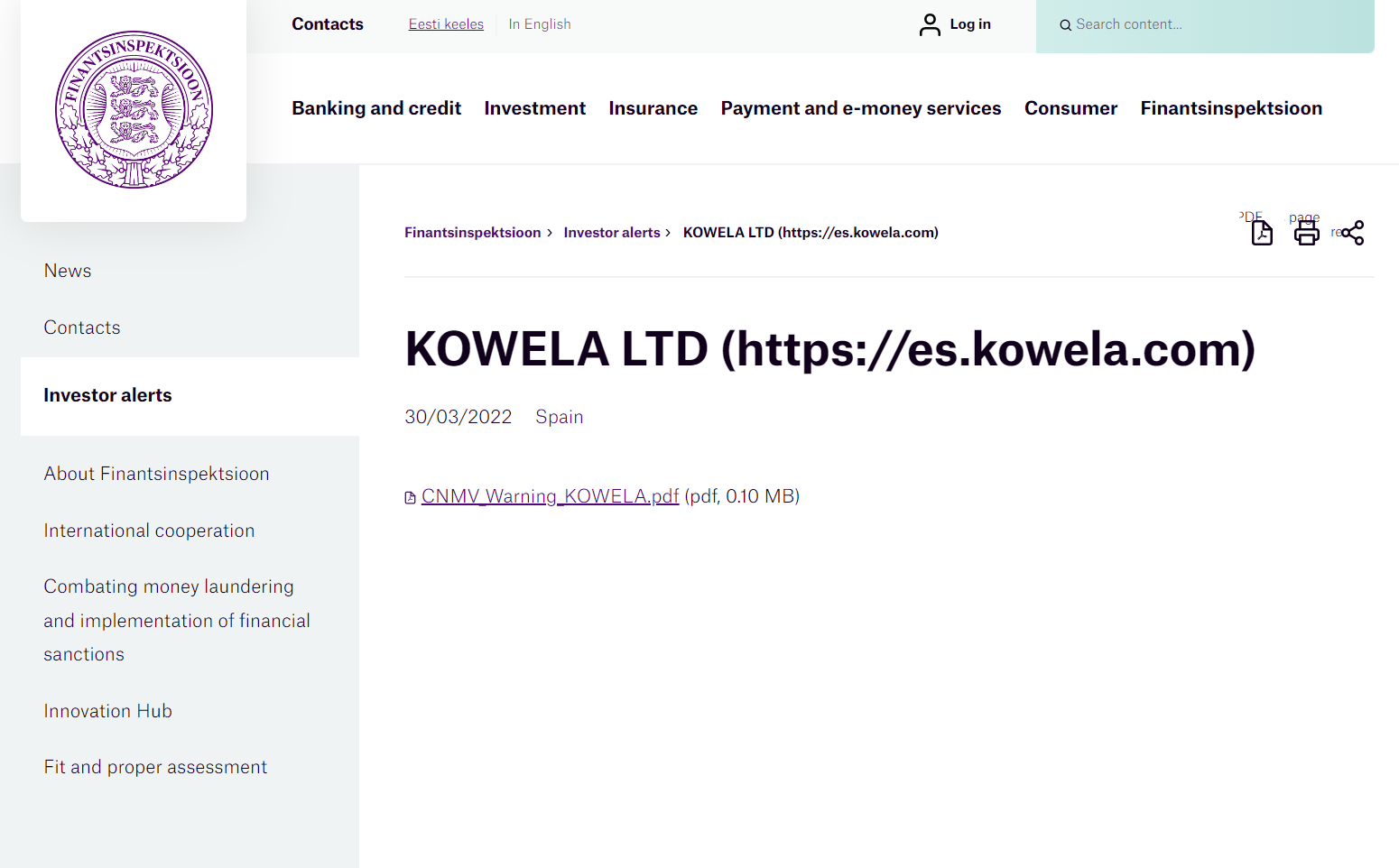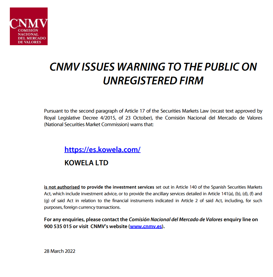 Kowela有限公司(https://es. Kowela .com) 30/03/2022 西班牙 cnmv 根据《证券市场法》(经 10 月 23 日第 4/2015 号皇家立法令批准的重订文本)第 17 条第 2 款向公众发出关于未注册公司的警告,委员会nacional del Mercado de valores(国家证券市场委员会)警告说: Kowela有限公司无权提供《西班牙证券市场法》第 140 条规定的投资服务(其中包括投资建议),或提供第 141(a)、(b)、(d)、(f) 条详述的辅助服务。该法的 ) 和 (g) 项涉及该法第 2 条所述的金融工具,包括为此目的的外币交易。如有任何疑问,请拨打国家经济委员会咨询热线 900 535 015 或访问 cnmv 网站 (www.cnmv.es)。 2022 年 3 月 28 日 .