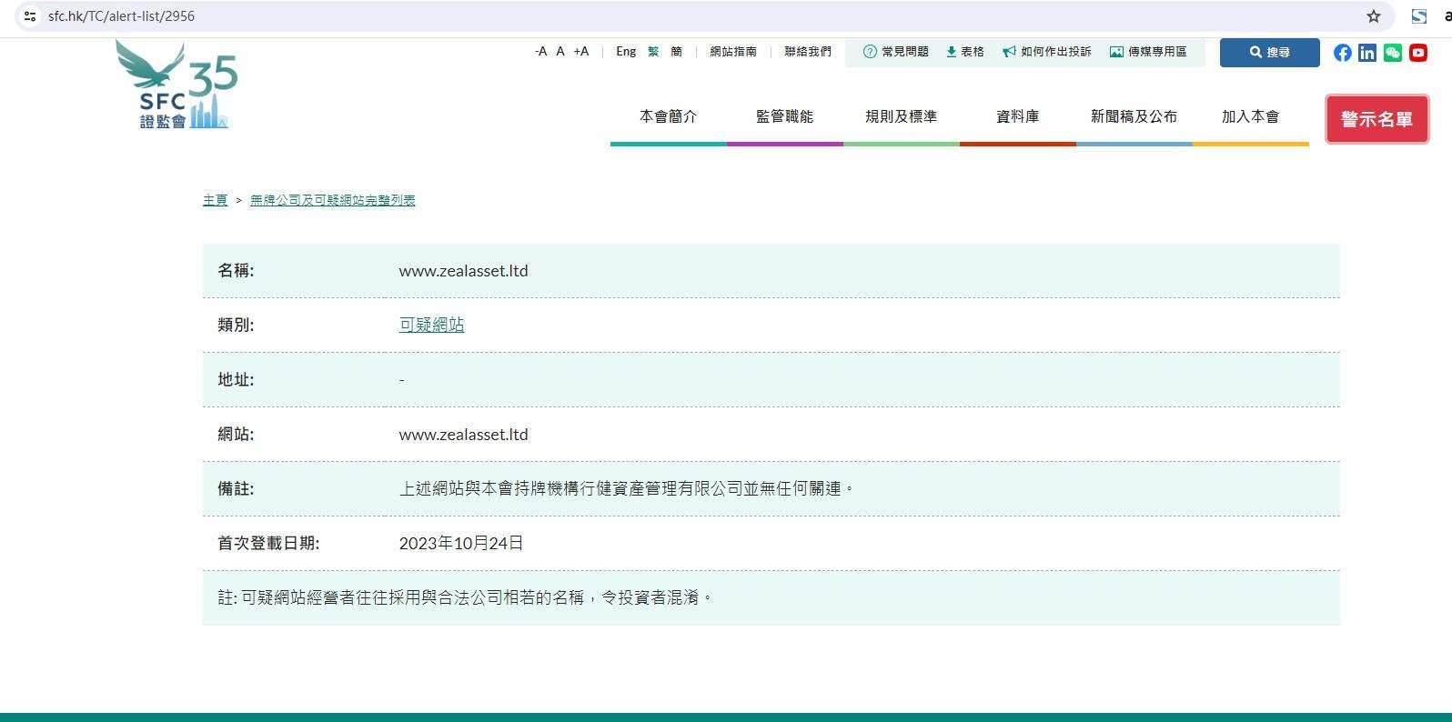 无牌公司及可疑网站名单列出了没有在香港领取牌照,并引起了证监会关注的公司。这些公司被怀疑现正或曾经以香港投资者为推销对象,又或声称与香港有联系。你可按名称或类别进行搜寻,以查证某公司是否已列入名单内。此名单并非详尽无遗。由于证监会经常都会发现一些值得注意的公司或网站, 因此我们会不时在名单内加入新的名称。若你曾经被无牌公司接触,请利用我们的网上投诉表格。有关锅炉室,欺诈网站和伪冒电邮的进一步资料,请按相关连结。注:无牌公司及可疑网站名单旨在及早向投资者发出警报。投资者不能只依赖上述名单的资料,他们需自行审慎查核个别公司的详情。请选取各栏内容名称的首个英文字母以取览名单,或点击“中文名称”栏目浏览只具中文名称的公司。 " 名称: www.zealasset.ltd 类别: 可疑网站地址: - 网站: www.zealasset.ltd 备注: 上述网站与本会持牌机构行健资产管理有限公司并无任何关连。 首次登载日期: 2023年10月24日注: 可疑网站经营者往往采用与合法公司相若的名称,令投资者混淆。
