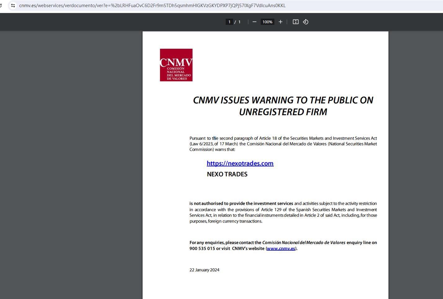 cnmv 根据《证券市场和投资服务法》(3 月 17 日第 6/2023 号法律)第 18 条第 2 款向公众发出关于未注册公司的警告。 : https:// NEXOTRADES .com Nexo trades 无权提供根据《西班牙证券市场和投资服务法》第 129 条的规定受到活动限制的投资服务和活动,涉及该法第 2 条详述的金融工具,包括出于这些目的的外币交易。如有任何疑问,请拨打国家经济委员会咨询热线 900 535 015 或访问 cnmv 网站 (www.cnmv.es)。 2024 年 1 月 22 日