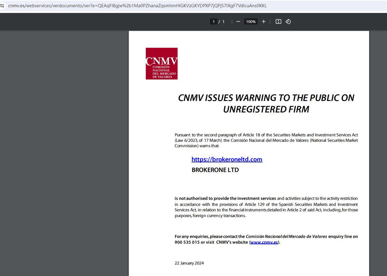 cnmv 根据《证券市场和投资服务法》(3 月 17 日第 6/2023 号法律)第 18 条第 2 款向公众发出关于未注册公司的警告。 :https://brokeroneltd.com BrokerOne LTD根据《西班牙证券市场和投资服务法》第 129 条的规定,无权提供受该法第 2 条详述的金融工具限制的投资服务和活动,包括:这些目的,外币交易。如有任何疑问,请拨打国家经济委员会咨询热线 900 535 015 或访问 cnmv 网站 (www.cnmv.es)。 2024 年 1 月 22 日