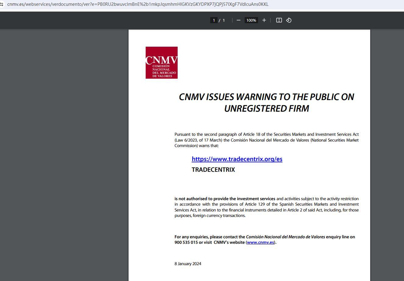 cnmv 根据《证券市场和投资服务法》(3 月 17 日第 6/2023 号法律)第 18 条第 2 款向公众发出关于未注册公司的警告。 :https://www. TradeCentrix .org/es TradeCentrix根据《西班牙证券市场和投资服务法》第 129 条的规定,无权提供受该法第 2 条详述的金融工具限制的投资服务和活动,包括:这些目的,外币交易。如有任何疑问,请拨打国家经济委员会咨询热线 900 535 015 或访问 cnmv 网站 (www.cnmv.es)。 2024 年 1 月 8 日
