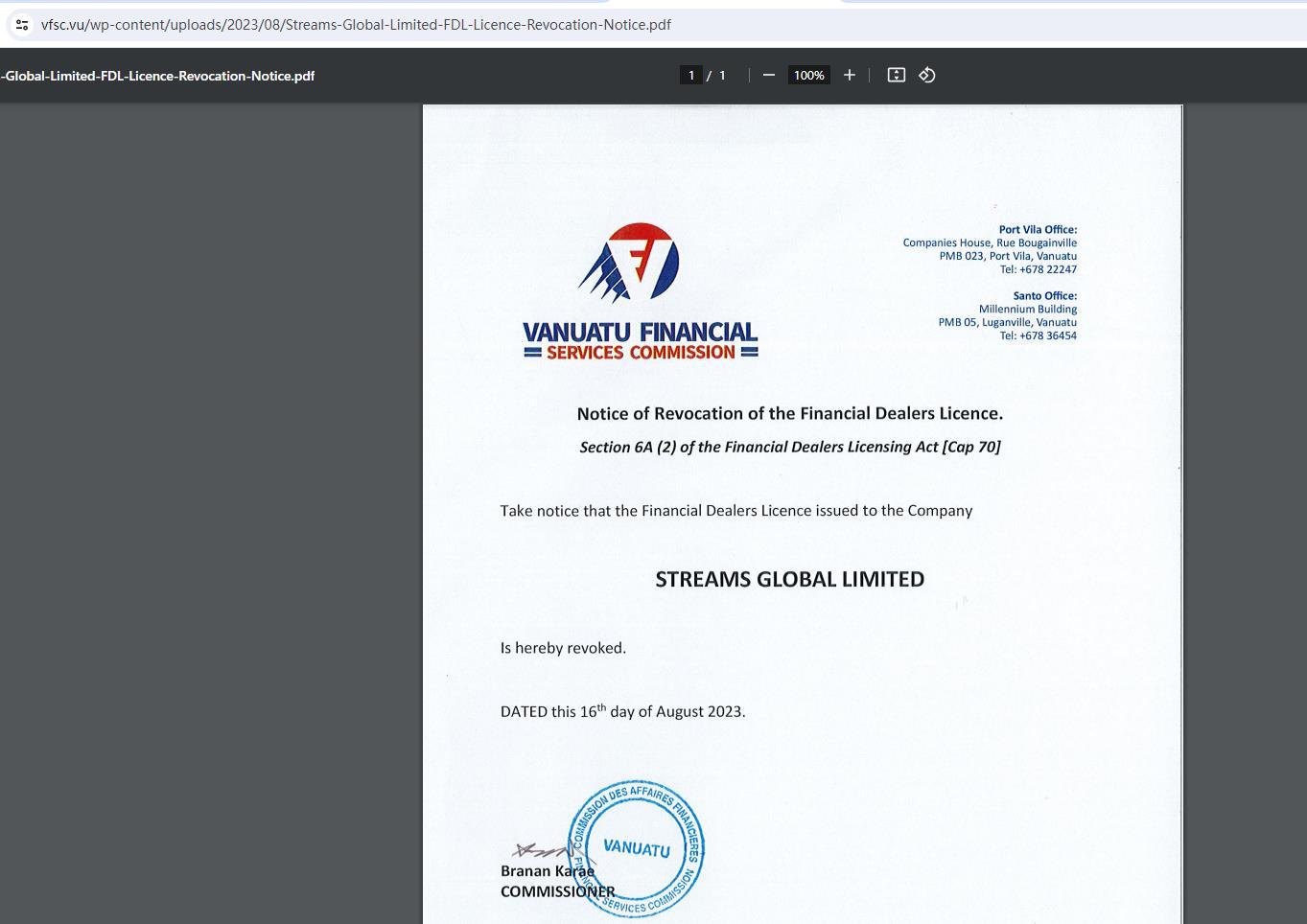 吊销金融交易商许可证的通知。 《金融交易商许可法》[第 70 章]第 6a (2) 条 请注意,向该公司颁发的金融交易商许可证 Streams Global Limited特此撤销,日期为 2023 年 8 月 16 日。 branan karae 专员