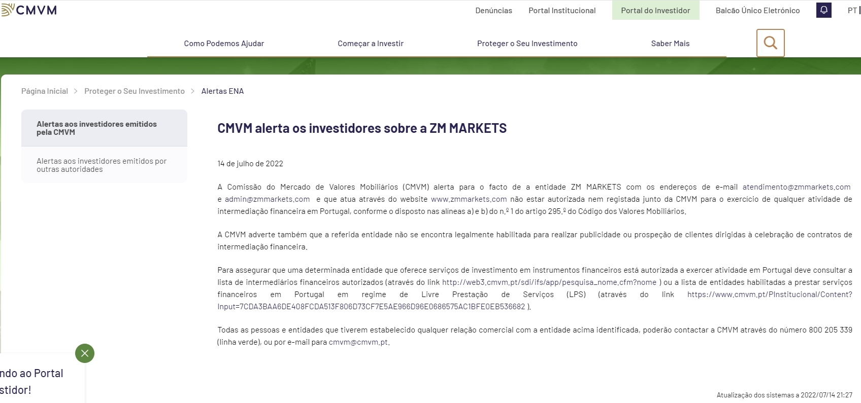 2022 年 7 月 14 日,证券市场委员会(cmvm)就该实体发出警报 ZM MARKETS根据第 a 项的规定,电子邮件地址为 atendimento@zmmarkets.com 和 admin@zmmarkets.com 且通过网站 www.zmmarkets.com 运营的公司未获得 cmvm 授权或注册,可在葡萄牙开展任何金融中介活动《证券法》第 295 条第 1 款的 ) 和 b) 项。 cmvm 还警告称,上述实体不具备为签订金融中介合同而进行广告或寻找客户的法律资格。为了确保提供金融工具投资服务的特定实体获得授权在葡萄牙开展活动,您必须查阅授权金融中介机构列表(通过链接 http://web3.cmvm.pt/sdi/ifs/app /pesquisa_nome .cfm?nome )或根据免费提供服务 (lps) 制度授权在葡萄牙提供金融服务的实体列表(通过链接 https://www.cmvm.pt/pinstitucional/content?input=7cda3baa6de408fcda513f806d73cf7e5ae966d96e0686575ac1bfe0eb536682 )。与上述实体建立任何商业关系的所有个人和实体都可以通过电话号码 800 205 339(绿线)或发送电子邮件至 cmvm@cmvm.pt 联系 cmvm。系统更新时间:2022/07/14 21:27