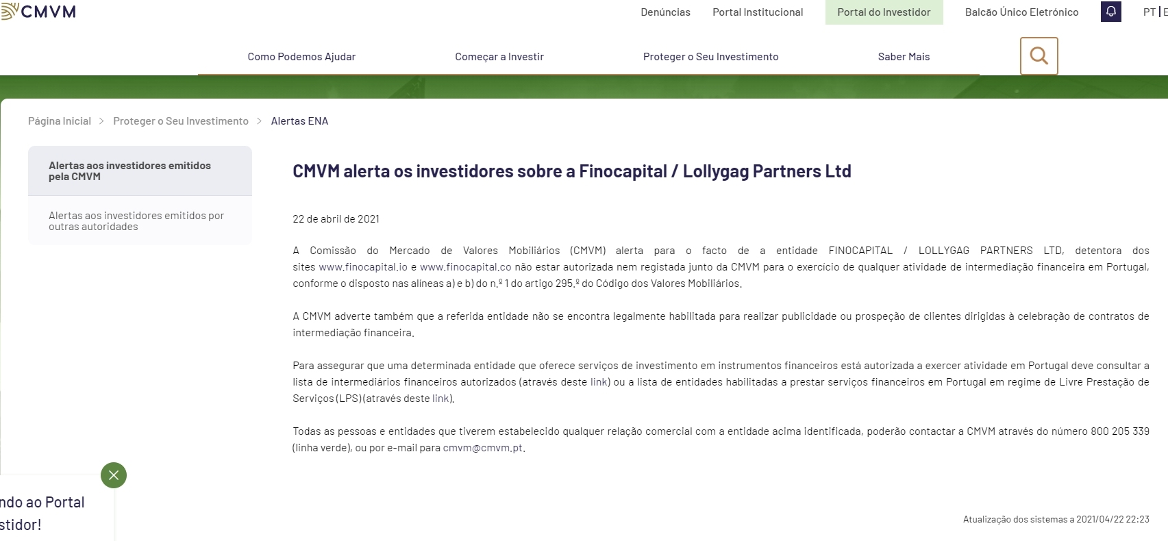 2021 年 4 月 22 日,证券市场委员会 (cmvm) 就该实体发出警报 FinoCapital/ Lollygag Partners LTD ,网站 www. 的所有者。 FinoCapital .io 和 www。 FinoCapital根据《证券法》第 295 条第 1 款 a) 和 b) 项的规定,.co 未获得 cmvm 授权或注册,可在葡萄牙开展任何金融中介活动。 cmvm 还警告称,上述实体不具备为签订金融中介合同而进行广告或寻找客户的法律资格。为确保提供金融工具投资服务的特定实体获得授权在葡萄牙开展活动,您必须查阅授权金融中介机构列表(通过此链接)或根据以下规定获得授权在葡萄牙提供金融服务的实体列表:免费制度提供服务(lps)(通过此链接)。与上述实体建立任何商业关系的所有个人和实体都可以通过电话号码 800 205 339(绿线)或发送电子邮件至 cmvm@cmvm.pt 联系 cmvm。系统更新时间:2021/04/22 22:23
