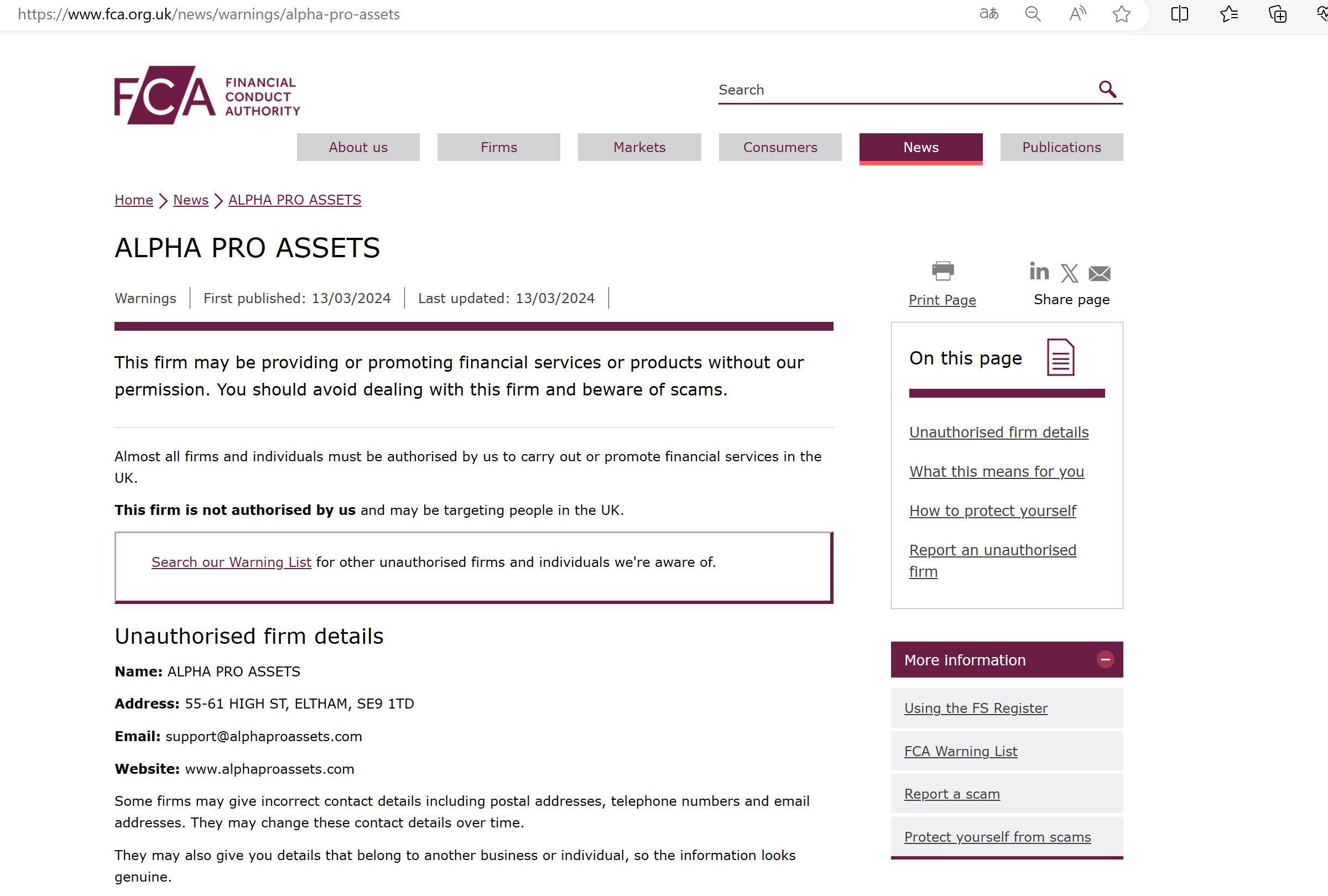 FCA未经授权公司警告名单 ALPHA PRO ASSETS.