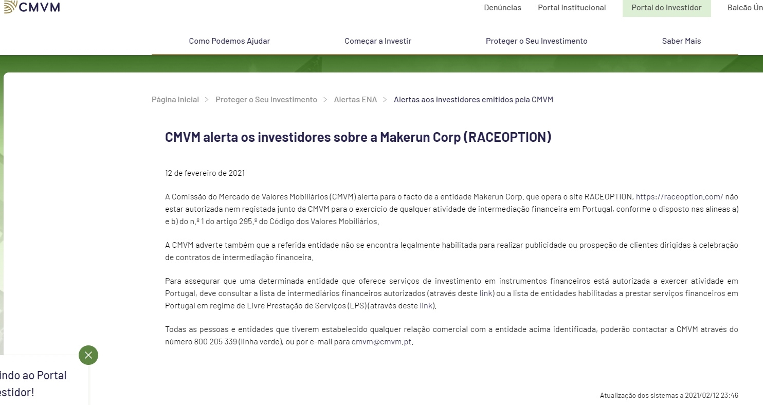CMVM 就 Makerun Corp (RACEOPTION) 向投资者发出警告