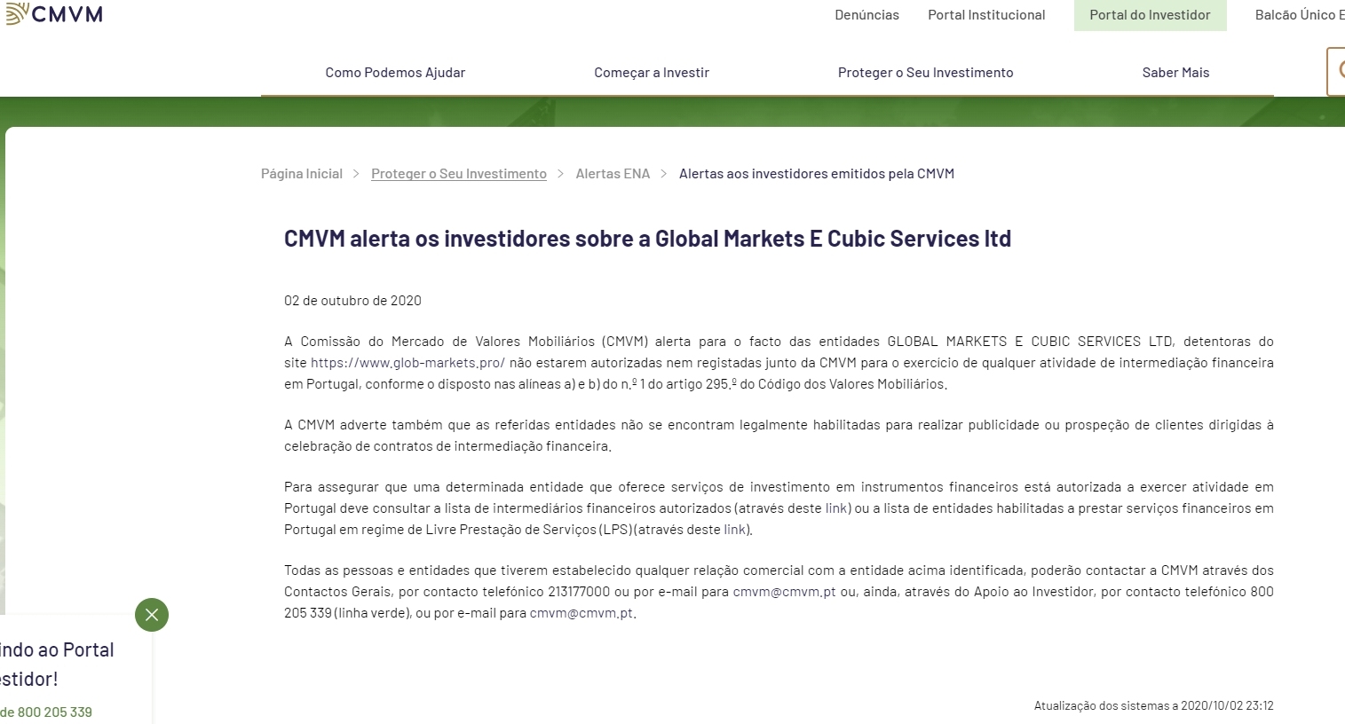 CMVM 就 Global Markets E Cubic Services ltd 向投资者发出警告