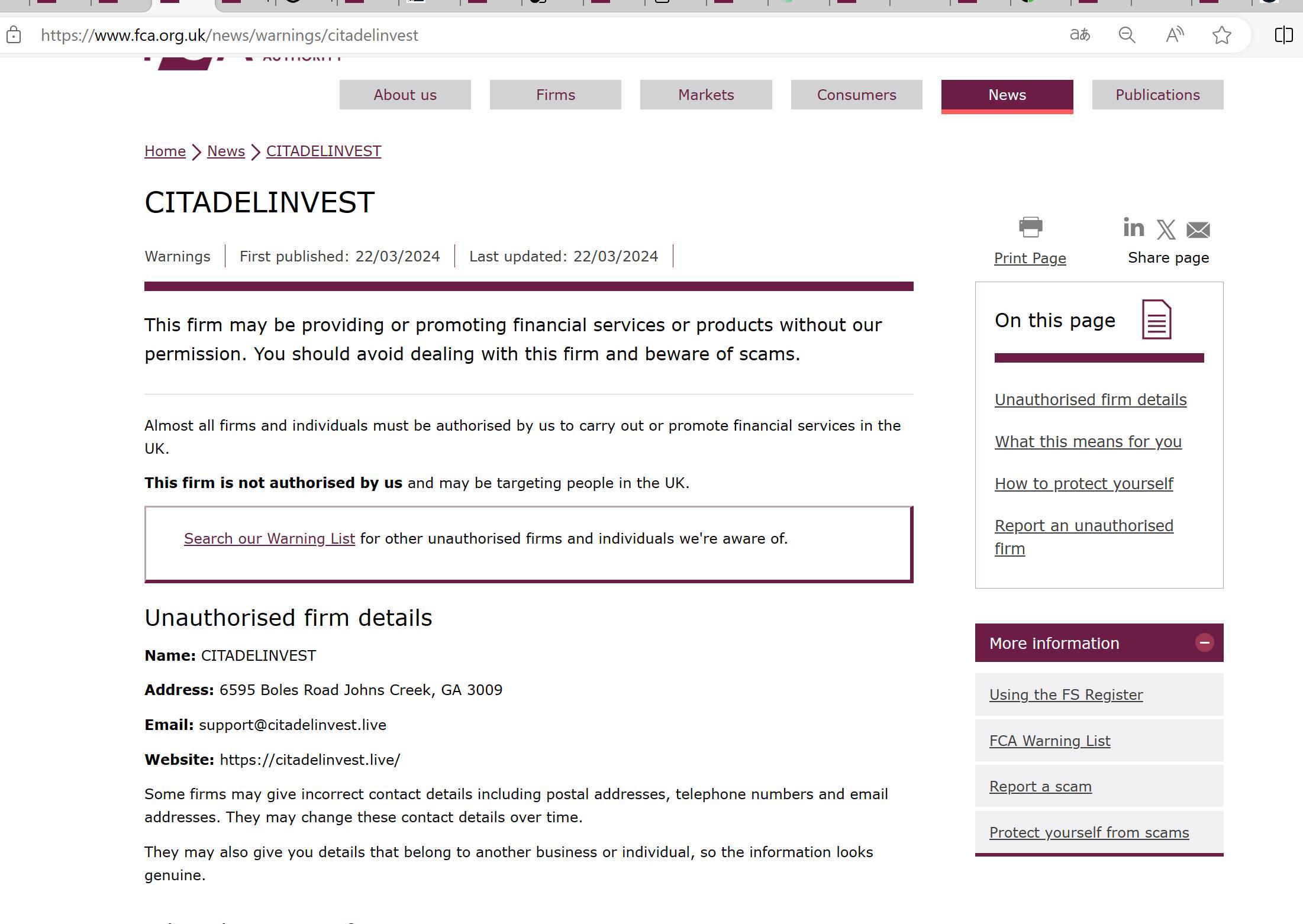首次发布:2024 年 3 月 22 日 最后更新:2024 年 3 月 22 日 该公司可能在未经我们许可的情况下提供或推广金融服务或产品。您应该避免与这家公司打交道并谨防诈骗。几乎所有公司和个人都必须获得我们的授权才能在英国开展或推广金融服务。该公司未经我们授权,可能针对英国人。在我们的警告列表中搜索我们所知的其他未经授权的公司和个人。未经授权的公司详细信息名称: CITADELINVEST地址:6595 boles road johns Creek, ga 3009 电子邮件:support@ CITADELINVEST .live网站:https:// CITADELINVEST .live/ 一些公司可能会提供不正确的联系方式,包括邮政地址、电话号码和电子邮件地址。随着时间的推移,他们可能会更改这些联系方式。他们还可能向您提供属于其他企业或个人的详细信息,因此这些信息看起来是真实的。
