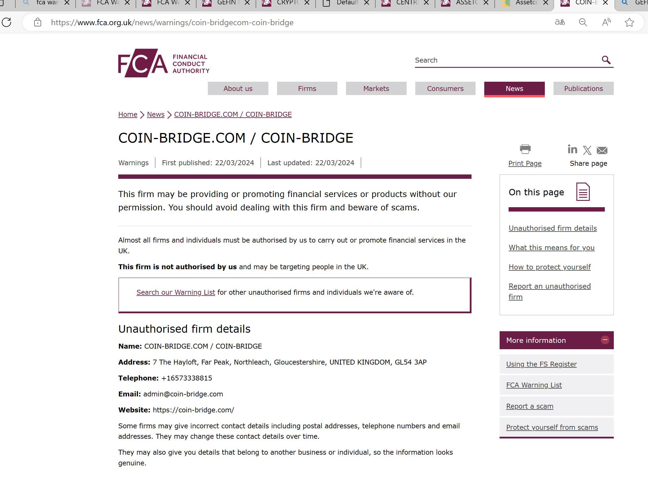 FCA未经授权公司警告清单 COIN-BRIDGE.COM / COIN-BRIDGE.