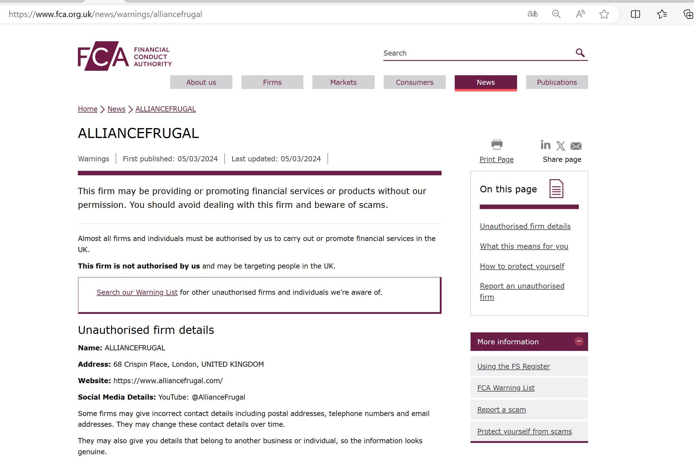 FCA未经授权公司警告清单 ALLIANCEFRUGAL.