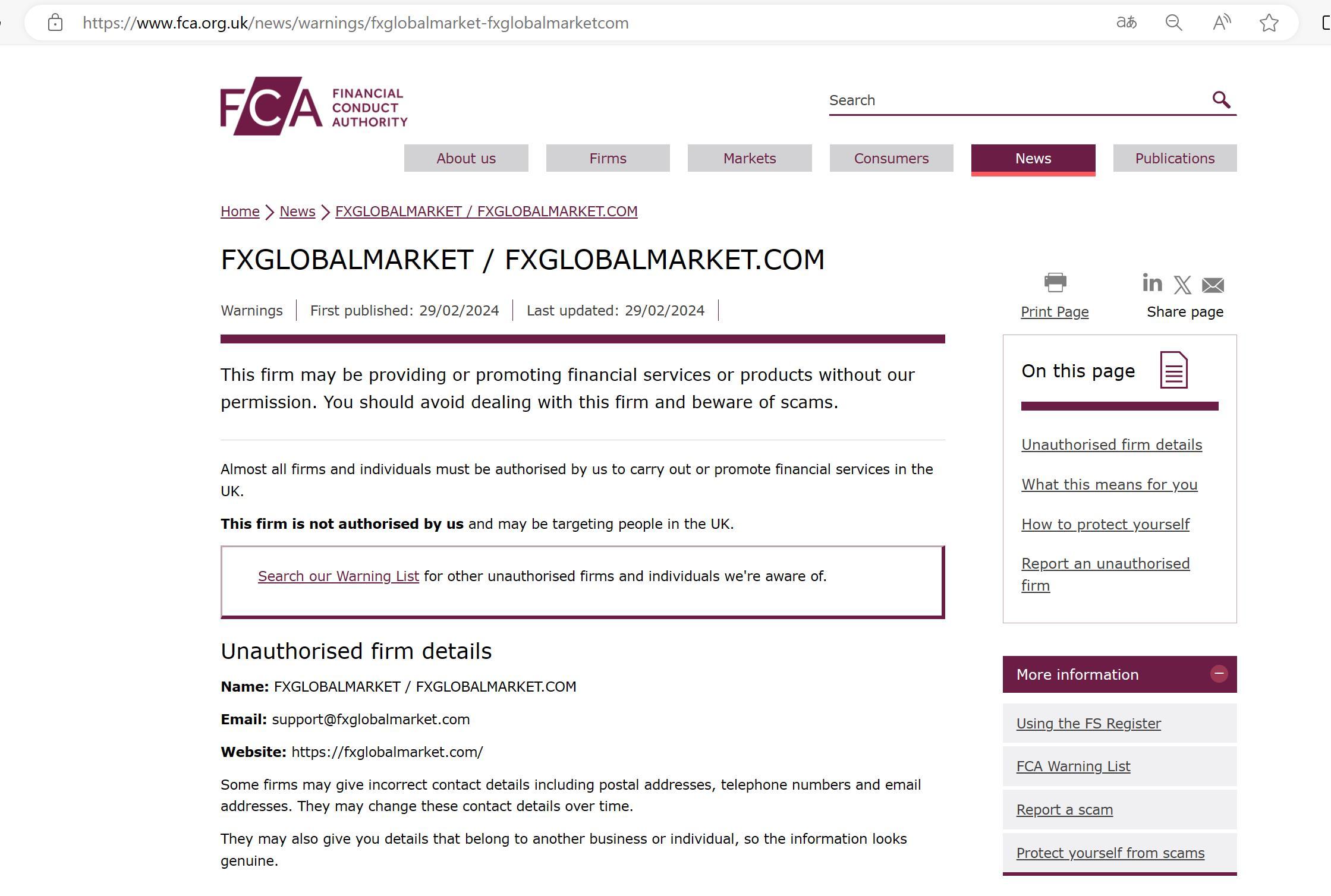 FCA未经授权公司警告名单:FXGLOBALMARKET.