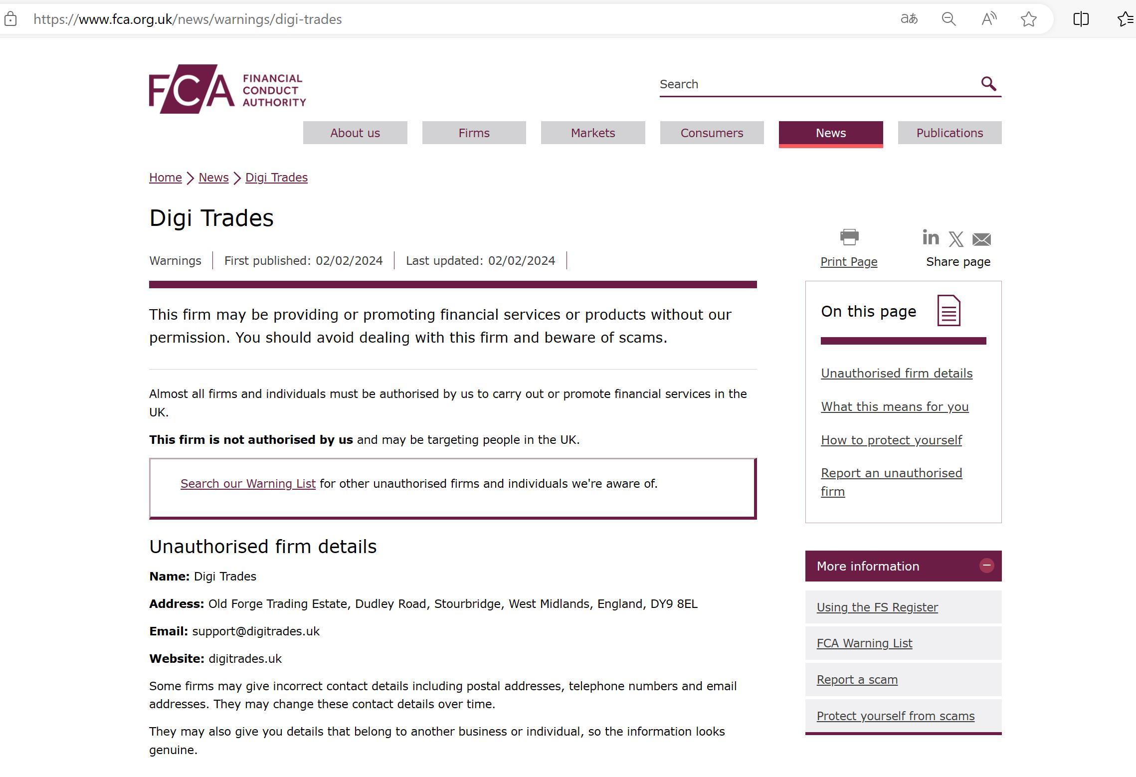 首次发布:2024 年 2 月 2 日 最后更新:2024 年 2 月 2 日 该公司可能在未经我们许可的情况下提供或推广金融服务或产品。您应该避免与这家公司打交道并谨防诈骗。几乎所有公司和个人都必须获得我们的授权才能在英国开展或推广金融服务。该公司未经我们授权,可能针对英国人。在我们的警告列表中搜索我们所知的其他未经授权的公司和个人。未经授权的公司详细信息名称: Digi Trades地址:old Forge Trading Estate, Dudley Road, Stourbridge, West Midlands, england, dy9 8el 电子邮件:support@digitrades.uk 网站:digitrades.uk 一些公司可能会提供不正确的联系方式,包括邮政地址、电话号码和电子邮件地址。随着时间的推移,他们可能会更改这些联系方式。他们还可能向您提供属于其他企业或个人的详细信息,因此这些信息看起来是真实的。
