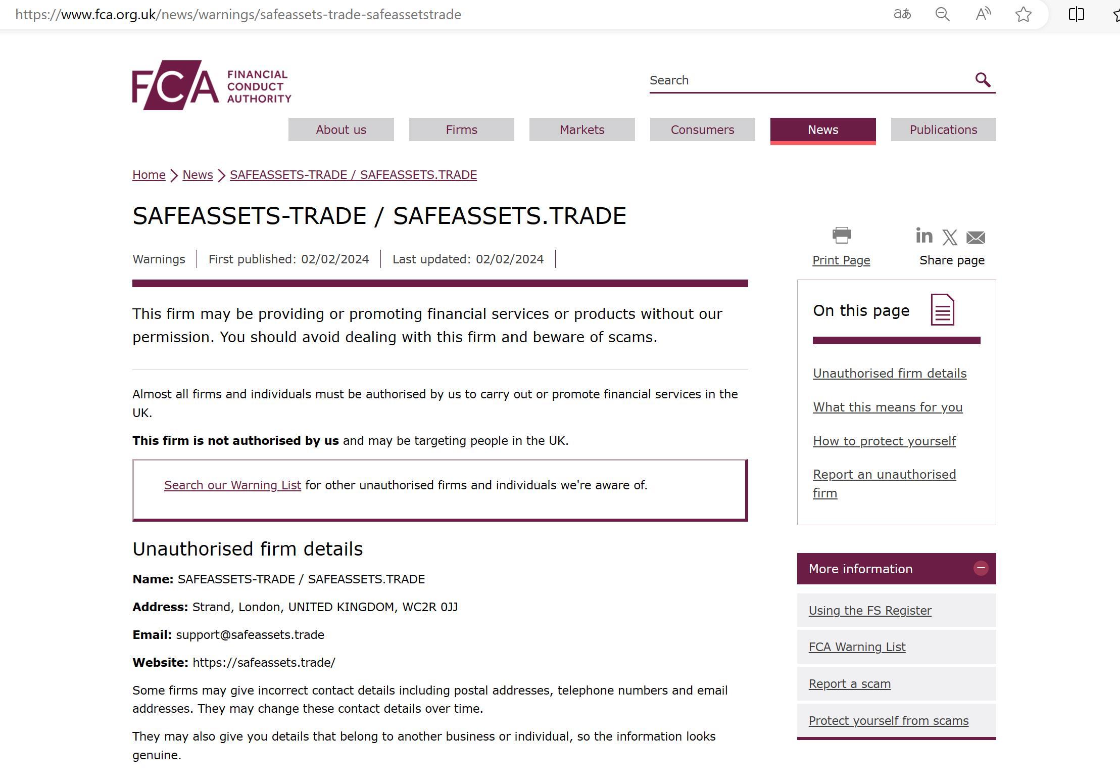 FCA未经授权公司警告名单 SAFEASSETS-TRADE / SAFEASSETS.TRADE.