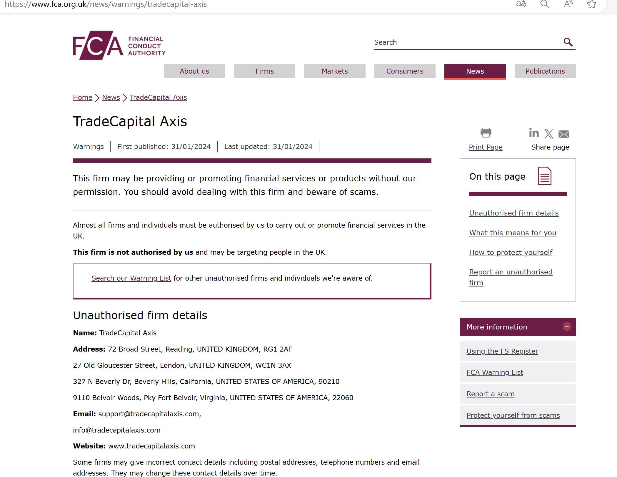 FCA未经授权公司警告名单:TradeCapital Axis.