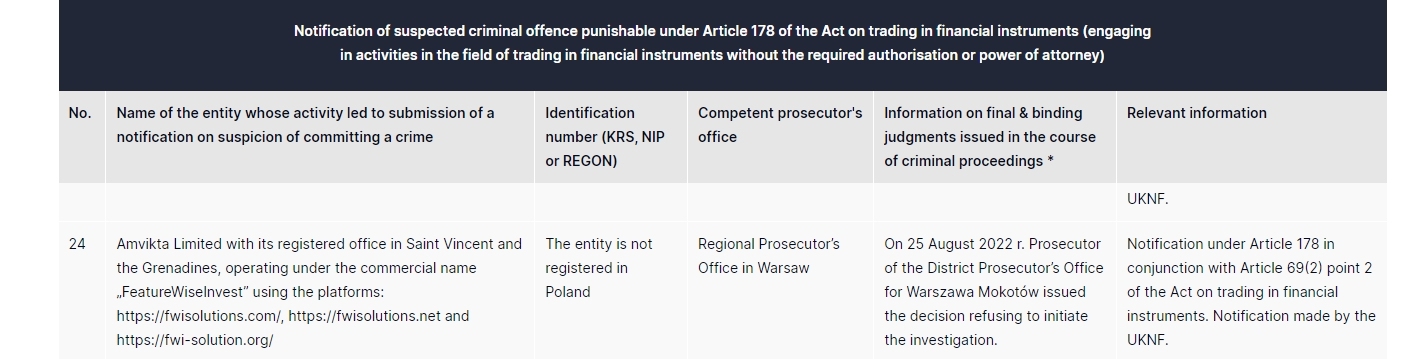 Amvikta Limited其注册办事处位于圣文森特和格林纳丁斯,以商业名称“ FeatureWiseInvest ” 使用以下平台:https://fwisolutions.com/、https://fwisolutions.net 和 https://fwi-solution.org/ 该实体未于 2022 年 8 月 25 日在华沙波兰地区检察官办公室注册。华沙莫科托夫地区检察官办公室检察官作出拒绝启动调查的决定。根据《金融工具交易法》第 178 条以及第 69(2)条第 2 点发出的通知。联合王国国家部队发出的通知。