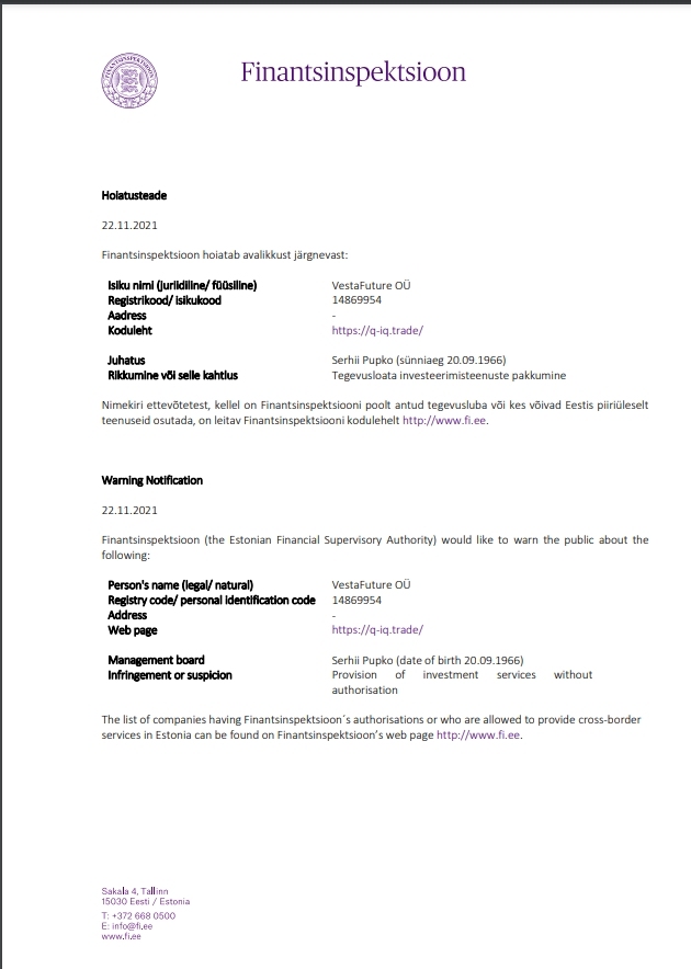投资者警示 VestaFuture OÜ (q-iq.trade).