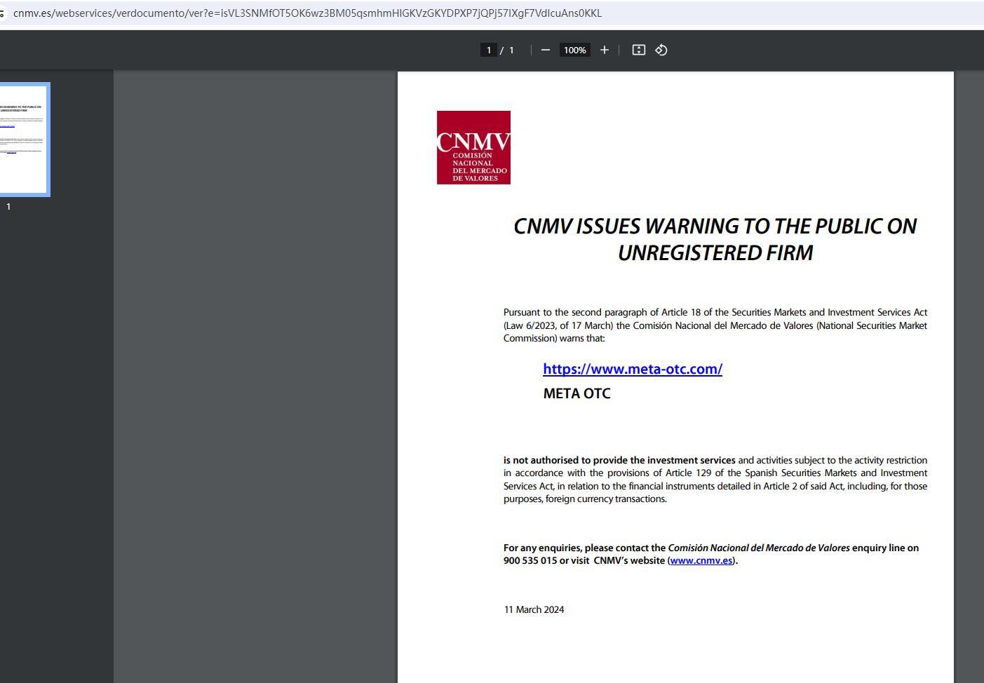 cnmv 向公众发出关于未注册公司的警告 根据《证券市场和投资服务法》(2023 年 3 月 17 日第 6/2023 号法律)第 18 条第二款,国家证券市场委员会 (comisión nacional del mercado de valores) 警告称:https://www.meta-otc.com/ META OTC根据西班牙证券市场和投资服务法第 129 条的规定,未获授权提供受活动限制的投资服务和活动,涉及该法第 2 条详述的金融工具,包括为此目的的外汇交易。如有任何疑问,请致电国家证券市场委员会咨询热线 900 535 015 或访问 cnmv 网站 (www.cnmv.es)。2024 年 3 月 11 日