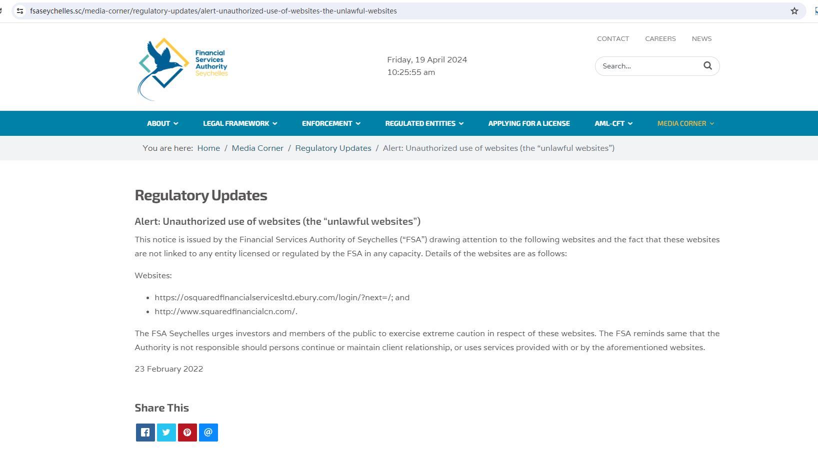 监管更新警告:未经授权使用网站(“非法网站”)此通知由塞舌尔金融服务管理局(“fsa”)发布,提请关注以下网站,且这些网站不以任何方式与任何由 fsa 许可或监管的实体有关联。网站详情如下:网站:https://osquaredfinancialservicesltd。 Ebury .com/login/?next=/;和 http://www.squaredfinancialcn.com/。塞舌尔金融服务管理局敦促投资者和公众对这些网站保持高度谨慎。金融服务管理局提醒,如果个人继续或维持客户关系,或使用上述网站提供的服务,该机构不承担任何责任。2022 年 2 月 23 日