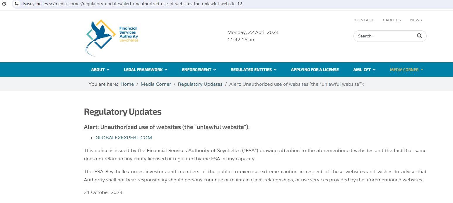 监管更新警报:未经授权使用网站(“非法网站”): GlobalFxExpert .com 本通知由塞舌尔金融服务管理局 (“fsa”) 发布,旨在提醒您注意上述网站,以及上述网站与任何获得 fsa 许可或监管的实体无关的事实。塞舌尔 fsa 敦促投资者和公众对这些网站保持高度谨慎,并希望告知,如果个人继续或维持客户关系,或使用上述网站提供的服务,该机构不承担任何责任。2023 年 10 月 31 日