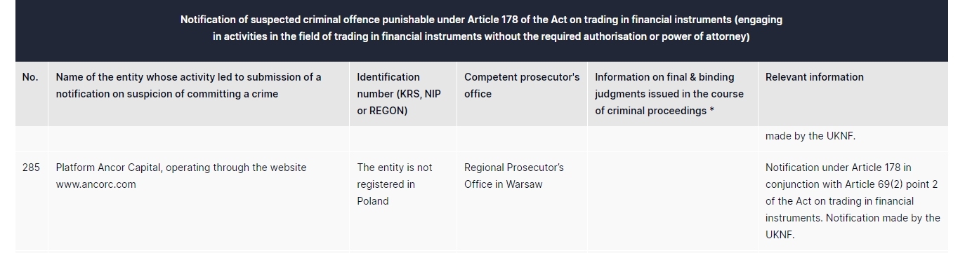 Ancor Capital 平台,通过网站 www.ancorc.com 运营。该实体未在波兰华沙地区检察院注册。根据《金融工具交易法》第 178 条和第 69(2) 点 2 的规定通知。通知由 UKNF 做出。