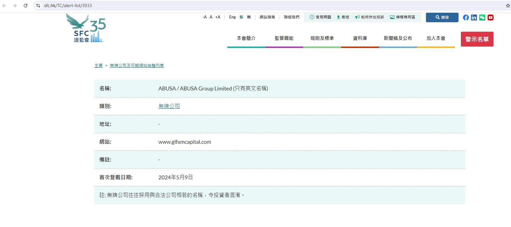 无牌公司及可疑网站名单列出了没有在香港领取牌照,并引起了证监会关注的公司。这些公司被怀疑现正或曾经以香港投资者为推销对象,又或声称与香港有联系。 你可按名称或类别进行搜寻,以查证某公司是否已列入名单内。 此名单并非详尽无遗。由于证监会经常都会发现一些值得注意的公司或网站, 因此我们会不时在名单内加入新的名称。 若你曾经被无牌公司接触,请利用我们的网上投诉表格。 有关锅炉室,欺诈网站和伪冒电邮的进一步资料,请按相关连结。 注:无牌公司及可疑网站名单旨在及早向投资者发出警报。投资者不能只依赖上述名单的资料,他们需自行审慎查核个别公司的详情。 请选取各栏内容名称的首个英文字母以取览名单,或点击“中文名称”栏目浏览只具中文名称的公司。 名称: ABUSA / ABUSA GROUP LIMITED (只有英文名称) 类别: 无牌公司地址: - 网站: www.glfxmcapital.com 备注: - 首次登载日期: 2024年5月9日注: 无牌公司往往采用与合法公司相若的名称,令投资者混淆。
