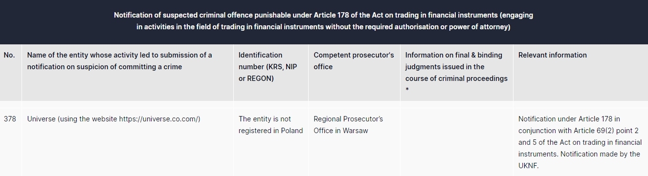 universe(使用网站 https:// universe .co.com/) 该实体未在波兰华沙地区检察官办公室注册根据《金融工具交易法》第 178 条以及第 69(2) 点 2 和 5 发出通知。由 uknf 发出的通知。