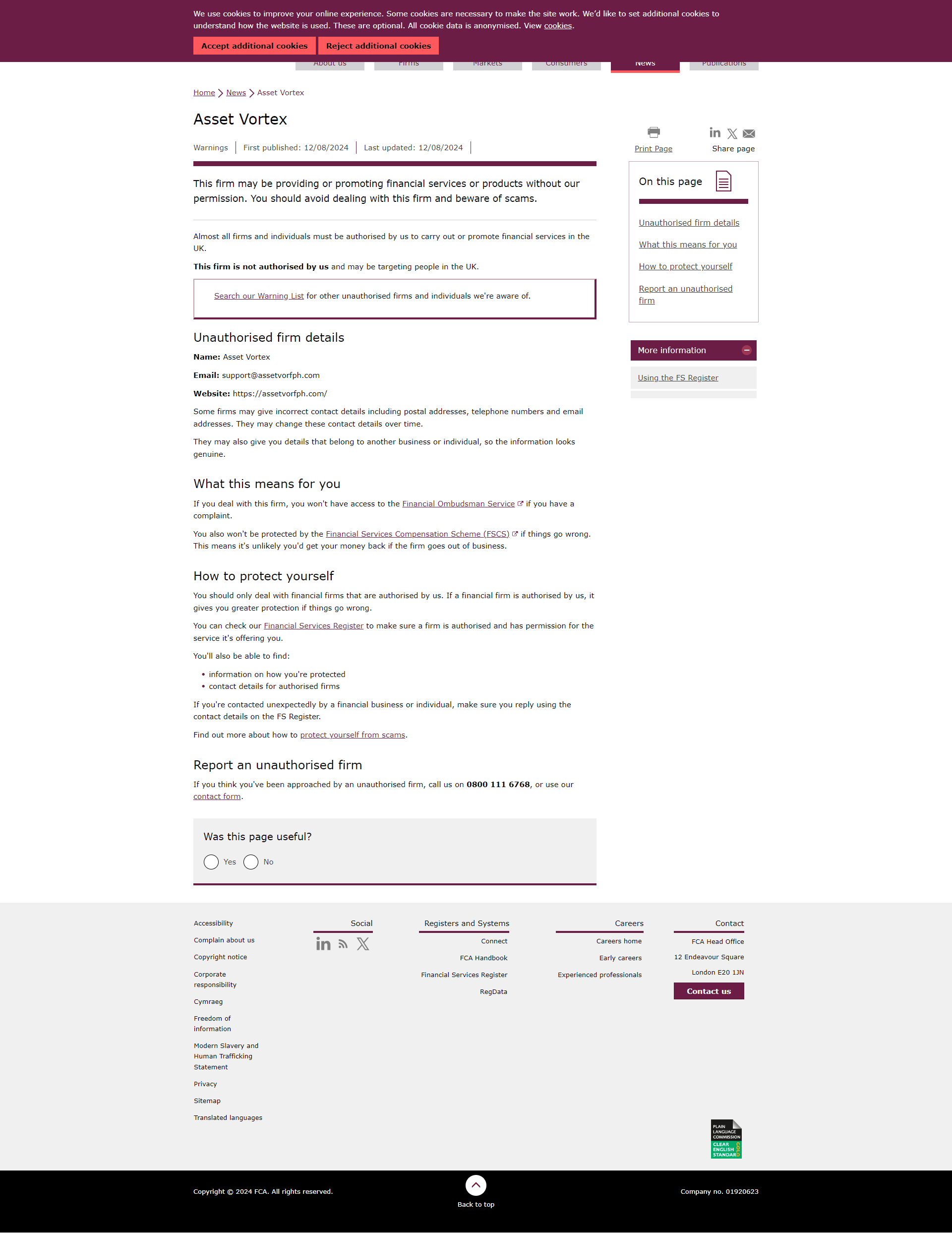 首次发布:2024 年 8 月 12 日 最后更新:2024 年 8 月 12 日 该公司可能在未经我们许可的情况下提供或推广金融服务或产品。您应避免与该公司打交道,并谨防诈骗。几乎所有公司和个人都必须获得我们的授权才能在英国开展或推广金融服务。该公司未获得我们的授权,可能针对英国人。在我们的警告列表中搜索我们所知的其他未经授权的公司和个人。未经授权的公司详细信息名称: Asset Vortex电子邮件:support@assetvorfph.com 网站:https://assetvorfph.com/ 一些公司可能会提供不正确的联系方式,包括邮政地址、电话号码和电子邮件地址。他们可能会随着时间的推移更改这些联系方式。他们还可能向您提供属于其他企业或个人的详细信息,因此这些信息看起来是真实的。.