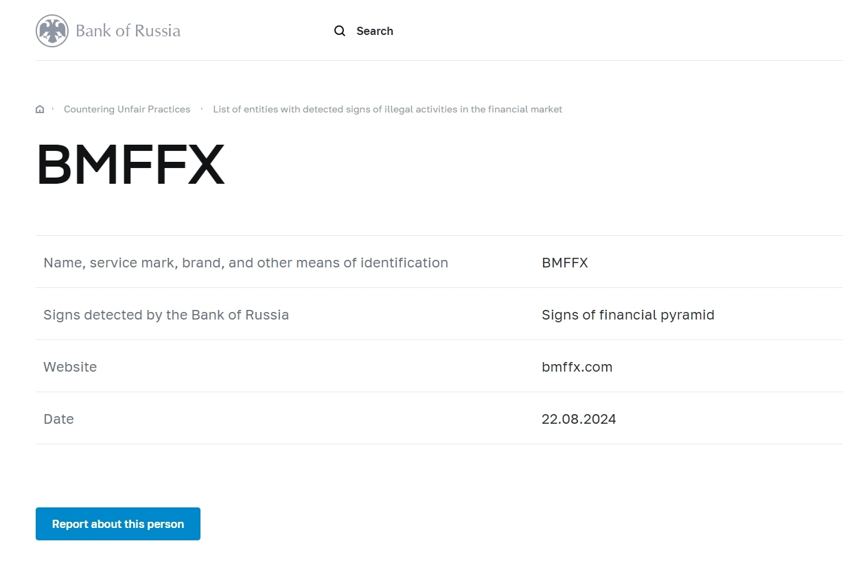 名称、服务标记、品牌和其他识别手段BMFFX 俄罗斯银行发现的迹象 金融金字塔迹象 网站 bmffx.com 日期 2024.08.22