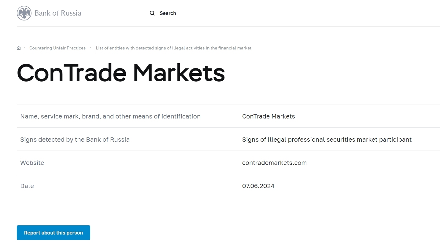 名称、服务标记、品牌和其他识别方式 ConTrade Markets俄罗斯银行发现的迹象 非法专业证券市场参与者的迹象 网站 contrademarkets.com 日期 07.06.2024