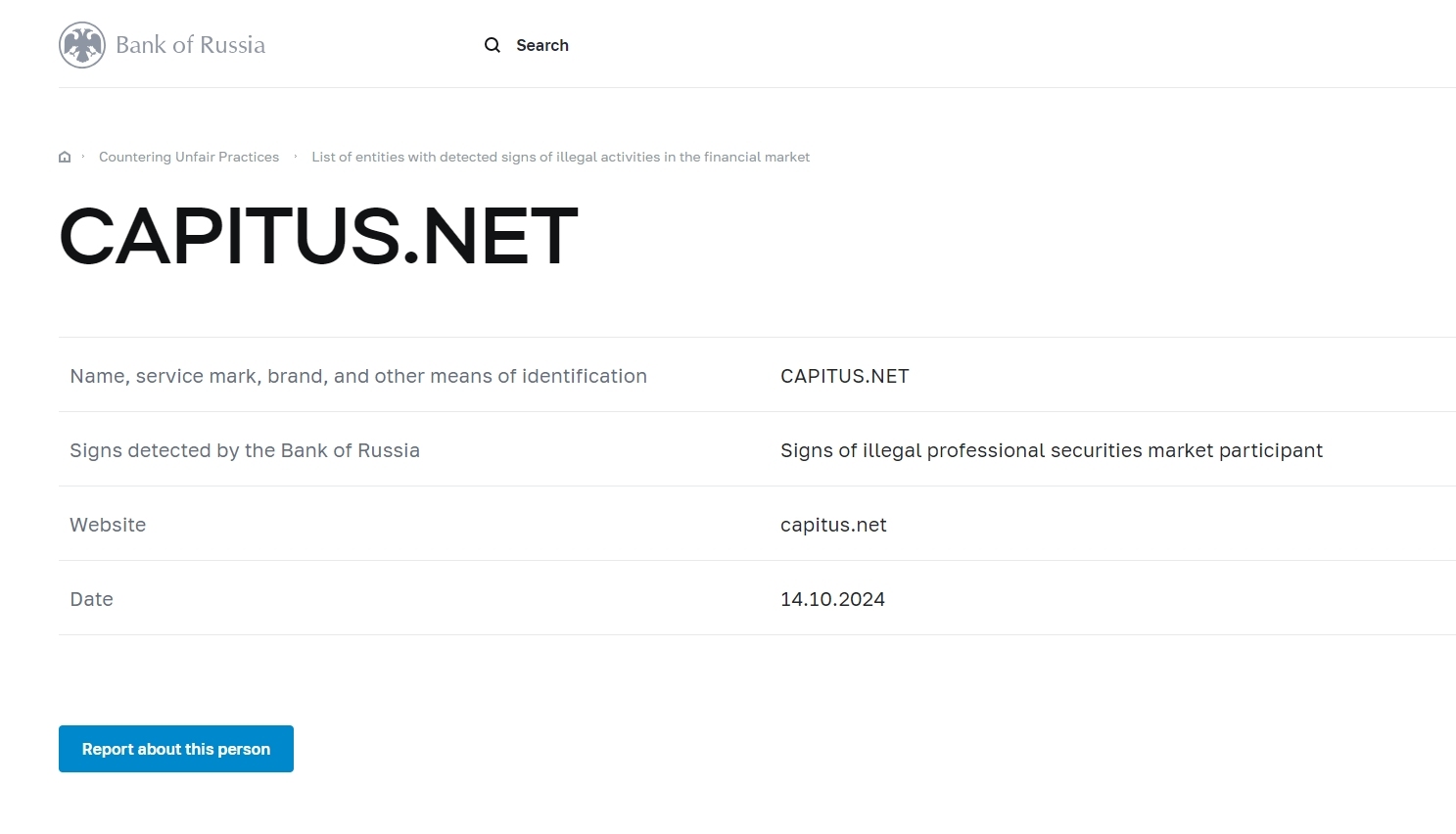 名称、服务标记、品牌和其他识别方式 Capitus俄罗斯银行检测到的.net 迹象表明存在非法专业证券市场参与者网站 Capitus.net 日期 2024 年 10 月 14 日