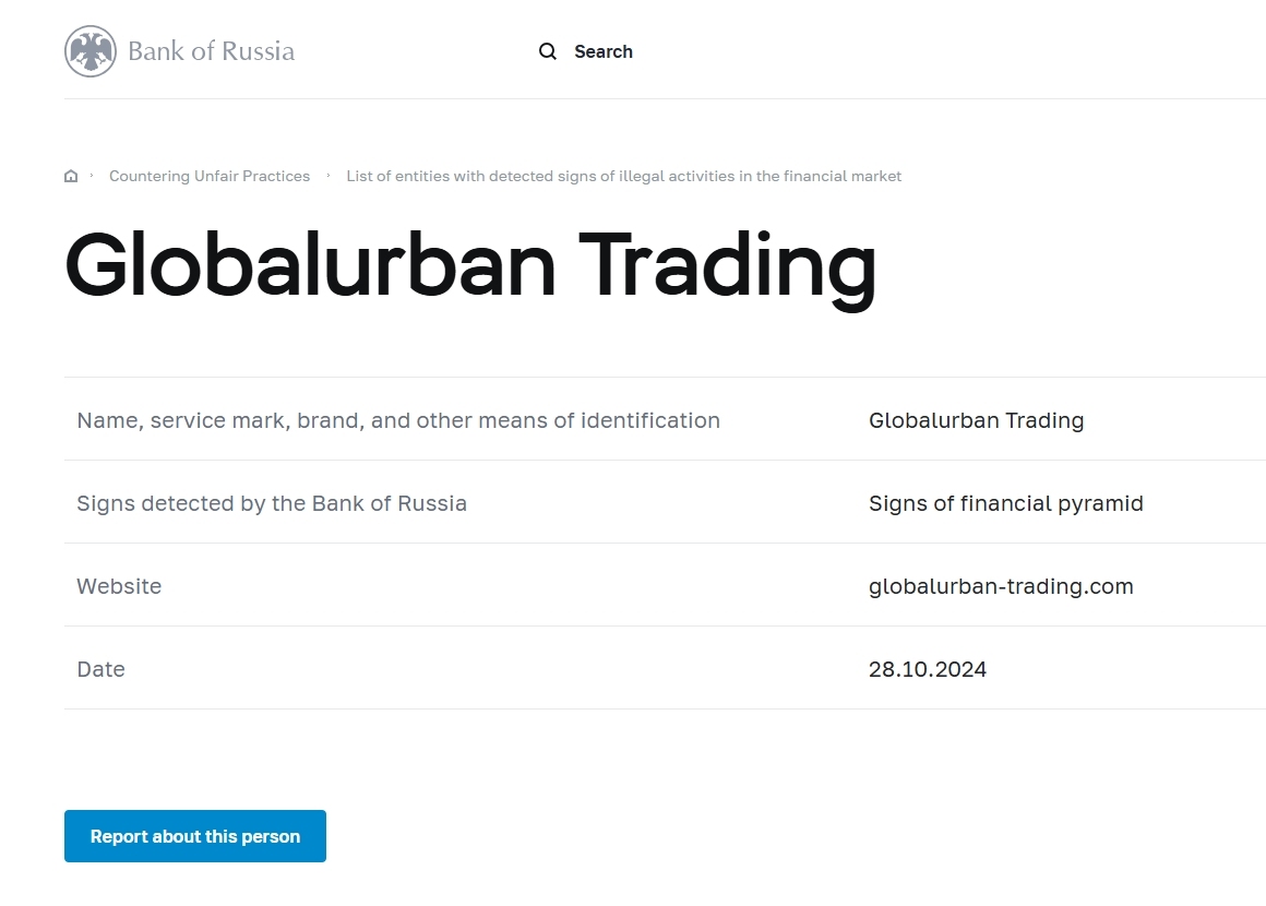 名称、服务标记、品牌和其他识别方式 Globalurban Trading俄罗斯银行发现的迹象 金融金字塔迹象 网站 globalurban-trading.com 日期 28.10.2024