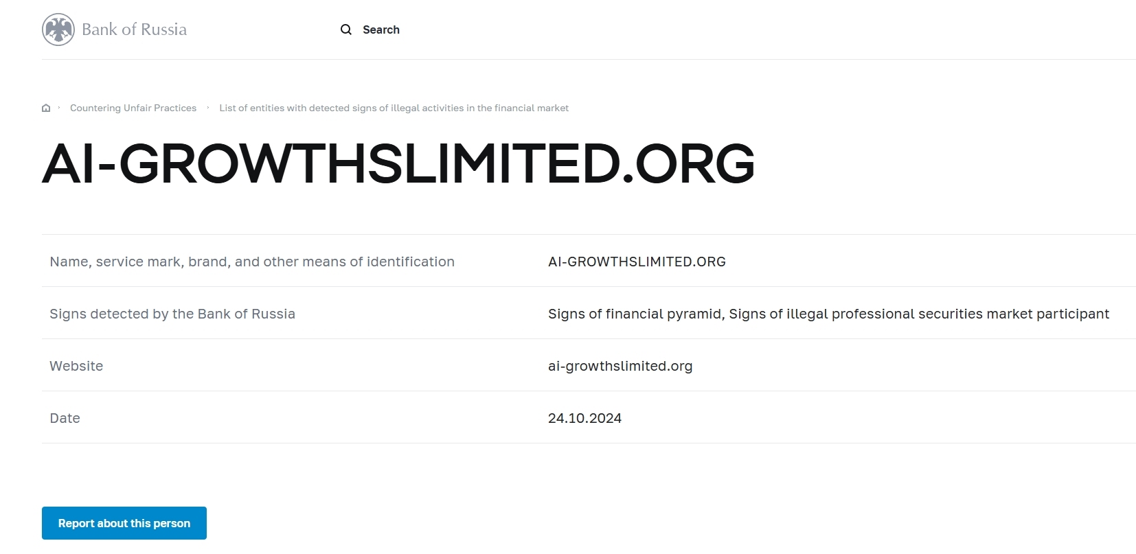 名称、服务标记、品牌和其他识别手段 AI-GROWTHSLIMITED.ORG 俄罗斯银行发现的迹象 金融金字塔迹象、非法专业证券市场参与者的迹象 网站 ai-growthslimited.org 日期 2024 年 10 月 24 日