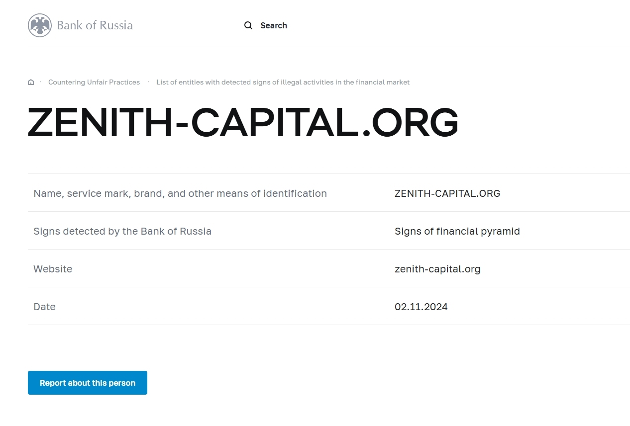名称、服务标记、品牌和其他识别方式 zenith-capital俄罗斯银行检测到的 .org 迹象 金融金字塔网站的迹象 zenith-capital.org 日期 2024 年 11 月 2 日