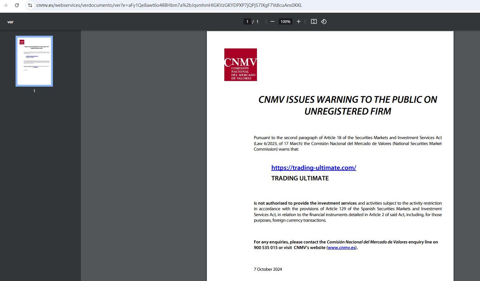 cnmv 向公众发出关于未注册公司的警告 根据《证券市场和投资服务法》(2023 年 3 月 17 日第 6/2023 号法律)第 18 条第二款,国家证券市场委员会 (comisión nacional del mercado de valores) 警告称:https:// Trading-Ultimate .com/ Trading Ultimate 未获授权提供根据西班牙证券市场和投资服务法第 129 条规定受活动限制的投资服务和活动,涉及该法第 2 条详述的金融工具,包括为此目的的外币交易。如有任何疑问,请致电国家证券市场委员会咨询热线 900 535 015 或访问 cnmv 网站 (www.cnmv.es)。2024 年 10 月 7 日