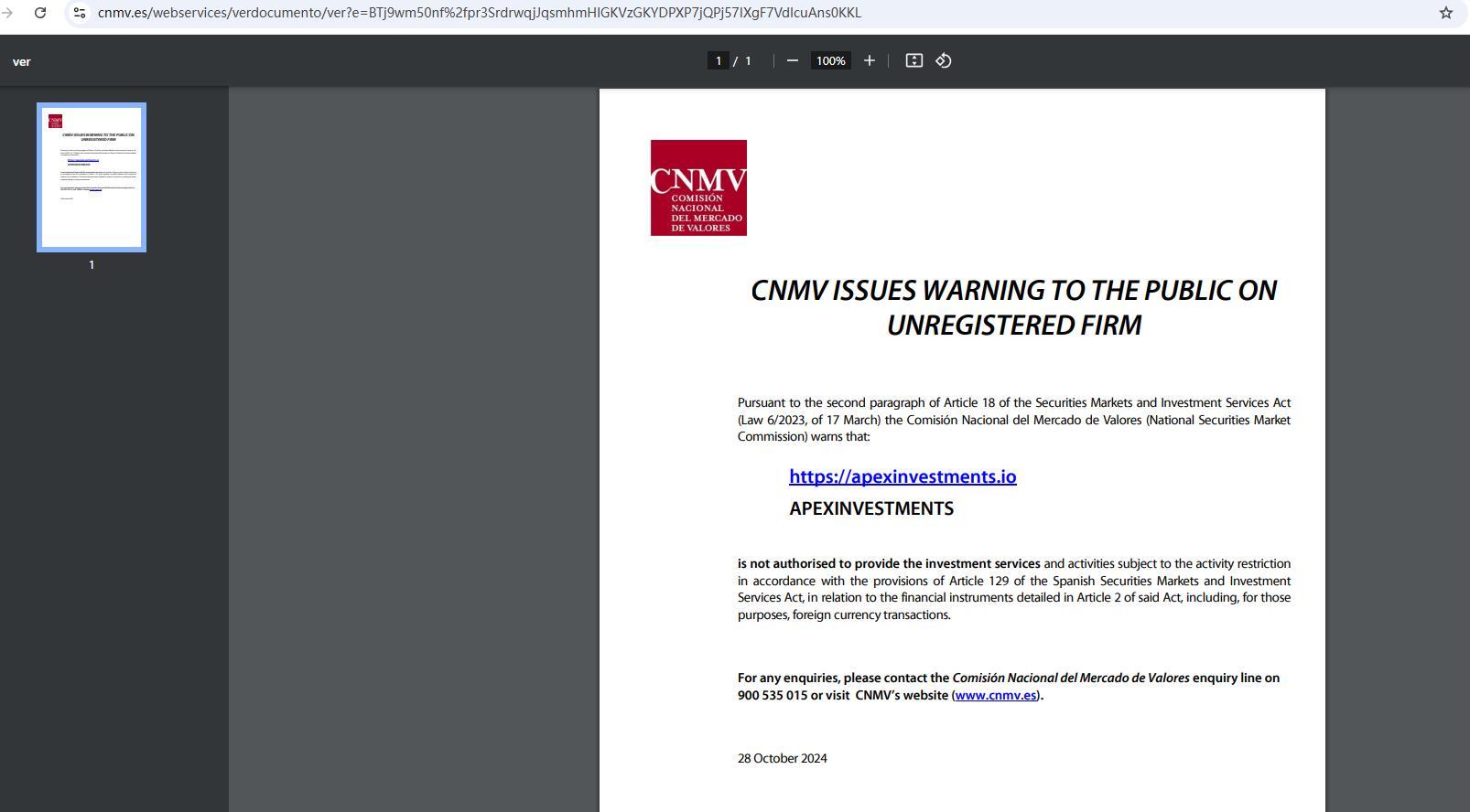 cnmv 向公众发出关于未注册公司的警告 根据《证券市场和投资服务法》(2023 年 3 月 17 日第 6/2023 号法律)第 18 条第二款,国家证券市场委员会 (comisión nacional del mercado de valores) 警告称:https:// ApexInvestments .io ApexInvestments未获授权提供根据西班牙证券市场和投资服务法第 129 条规定受到活动限制的投资服务和活动,涉及该法第 2 条详述的金融工具,包括为此目的的外汇交易。如有任何疑问,请致电国家证券市场委员会咨询热线 900 535 015 或访问 cnmv 网站 (www.cnmv.es)。2024 年 10 月 28 日