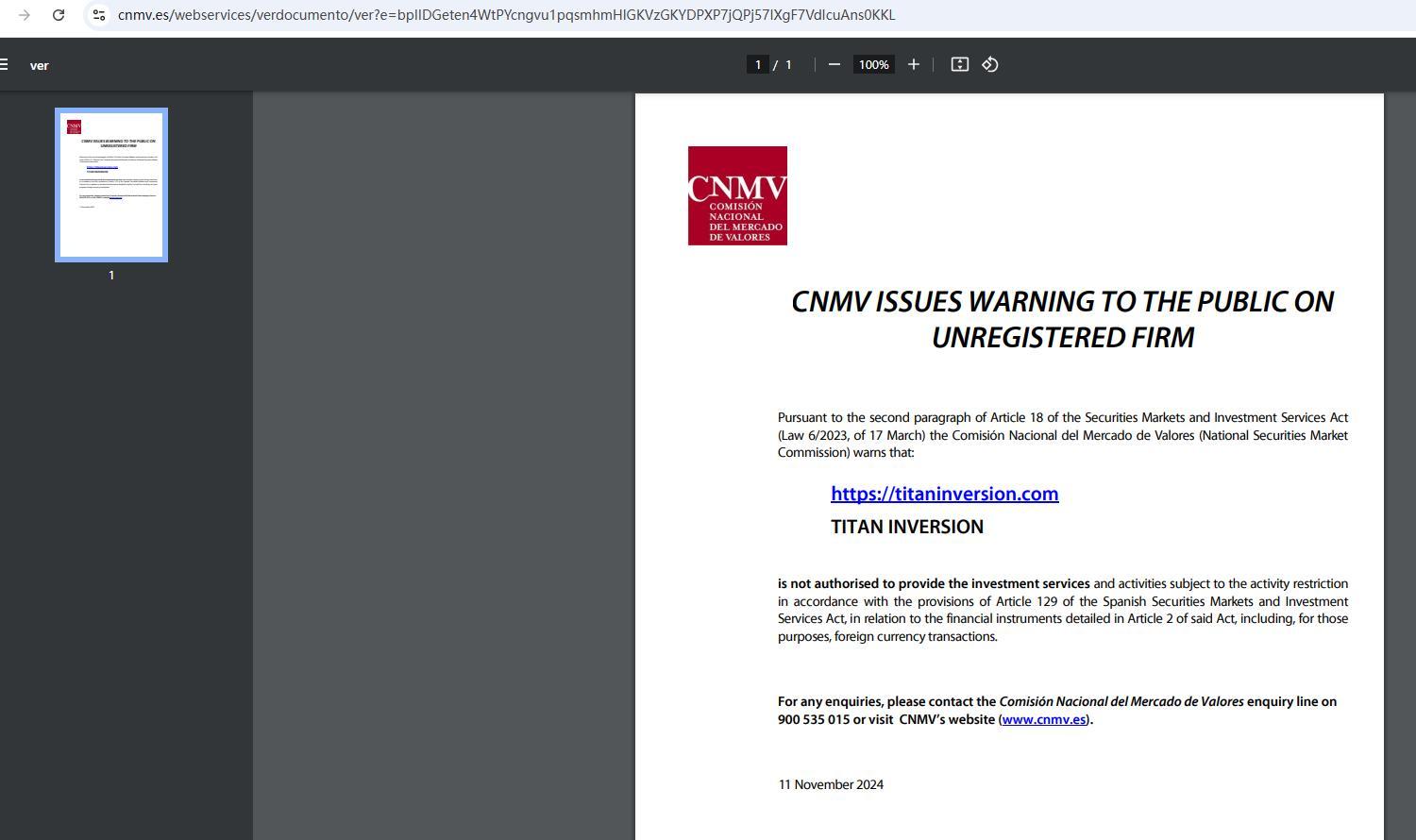 cnmv 向公众发出警告,称未注册公司违反了《证券市场和投资服务法》(2023 年 3 月 17 日第 6/2023 号法律)第 18 条第二款的规定,国家证券市场委员会 (comisión nacional del mercado de valores) 发出警告:https://titaninversion.com Titan Inversion根据西班牙证券市场和投资服务法第 129 条的规定,无权提供受活动限制的投资服务和活动,涉及该法第 2 条详述的金融工具,包括为此目的的外汇交易。如有任何疑问,请致电国家证券市场委员会咨询热线 900 535 015 或访问 cnmv 网站 (www.cnmv.es)。2024 年 11 月 11 日