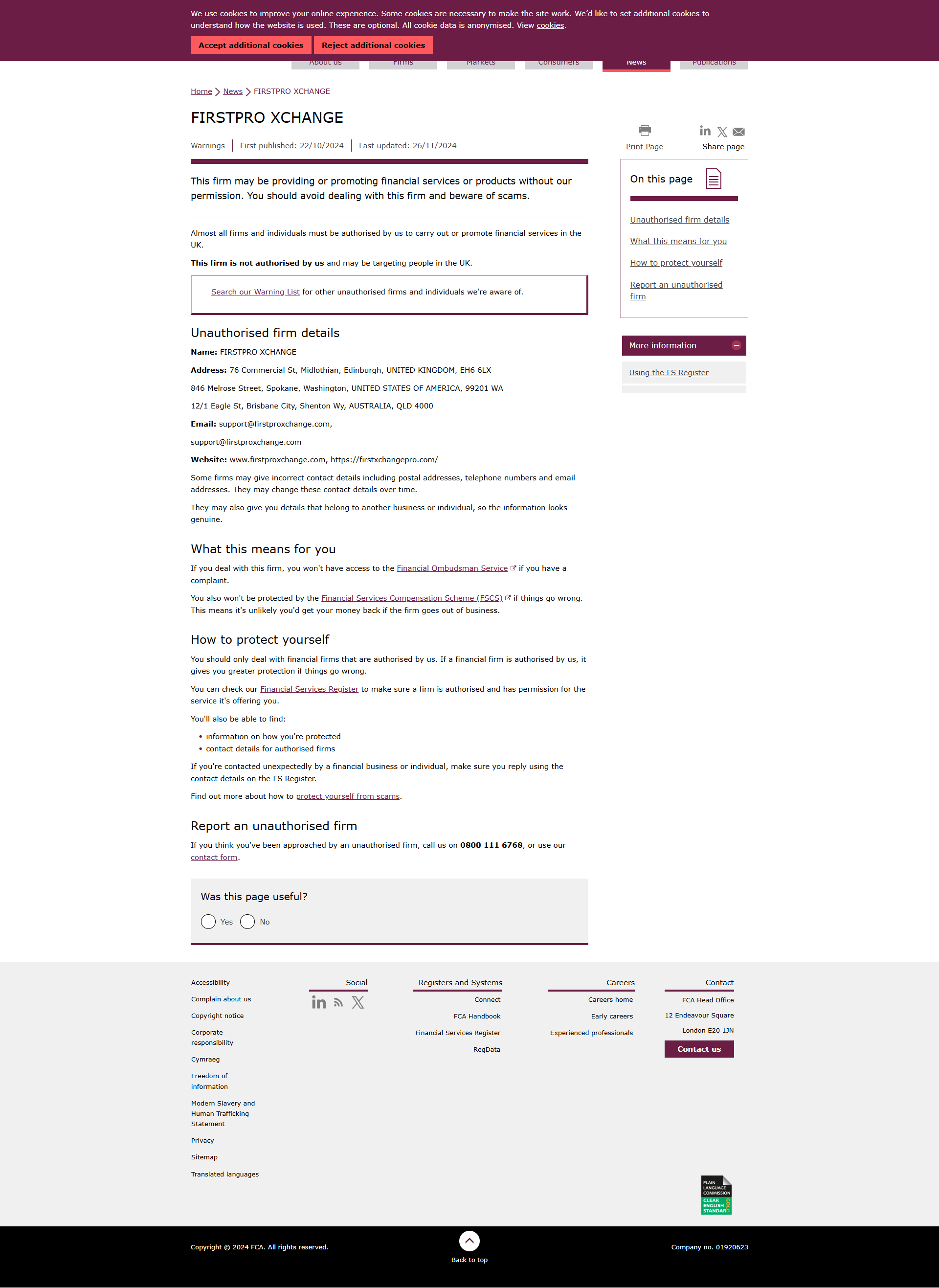 FCA未经授权公司警告名单:FIRSTPRO XCHANGE.