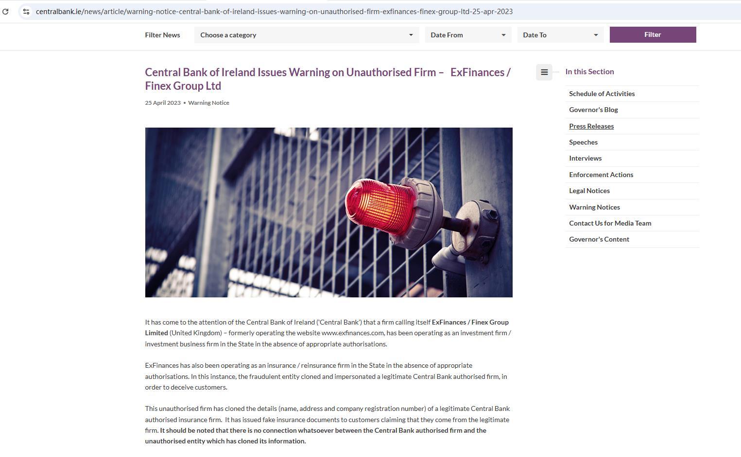 • 处罚原因 爱尔兰中央银行(“中央银行”)注意到,一家自称 EXFINANCES/ finex group limited (英国) – 以前运营网站 www. EXFINANCES .com 在缺乏适当授权的情况下,一直在该州作为一家投资公司/投资商业公司运营。