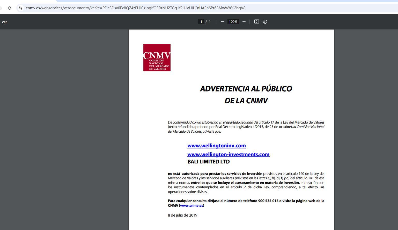 国家证券市场委员会向公众发出警告根据《证券市场法》第 17 条第二款的规定(经 2015 年 10 月 23 日第 4/2015 号皇家立法法令批准的合并文本),国家证券市场委员会警告称:www. WELLINGTONINV .com www.wellington-investments.com bali limited ltd 未获授权提供《证券市场法》第 140 条所规定的投资服务以及同一法律第 141 条 a)、b)、d)、f) 和 g) 项所规定的辅助服务,包括与该法律第 2 条所述工具有关的投资建议,为此目的还包括外汇交易。如有任何疑问,请致电 900 535 015 或访问 CNMV 网站 (www.cnmv.es) 2019 年 7 月 8 日