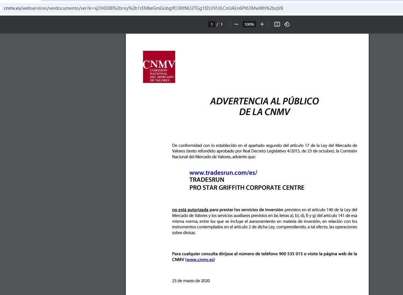国家证券市场委员会向公众发出警告根据《证券市场法》第 17 条第二款的规定(经 2015 年 10 月 23 日第 4/2015 号皇家立法法令批准的合并文本),国家证券市场委员会警告称:www. Tradesrun .com/en/ Tradesrun pro star griffith corporate centre 未获授权提供《证券市场法》第 140 条所规定的投资服务,以及该法第 141 条 a)、b)、d)、f) 和 g) 项所规定的辅助服务,包括与该法第 2 条所述工具有关的投资建议,为此目的还包括外汇交易。如有任何疑问,请致电 900 535 015 或访问 CNMV 网站 (www.cnmv.es) 2020 年 3 月 23 日