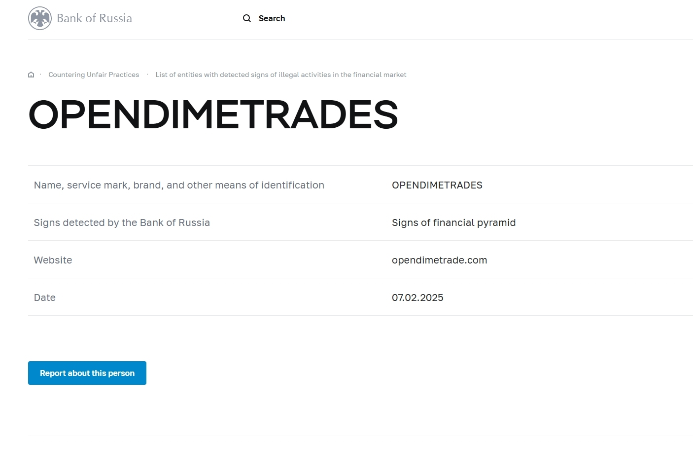 名称、服务标记、品牌和其他识别方式 OpendimeTrades俄罗斯银行发现的迹象 金融金字塔迹象 网站 opendimetrade.com 日期 07.02.2025