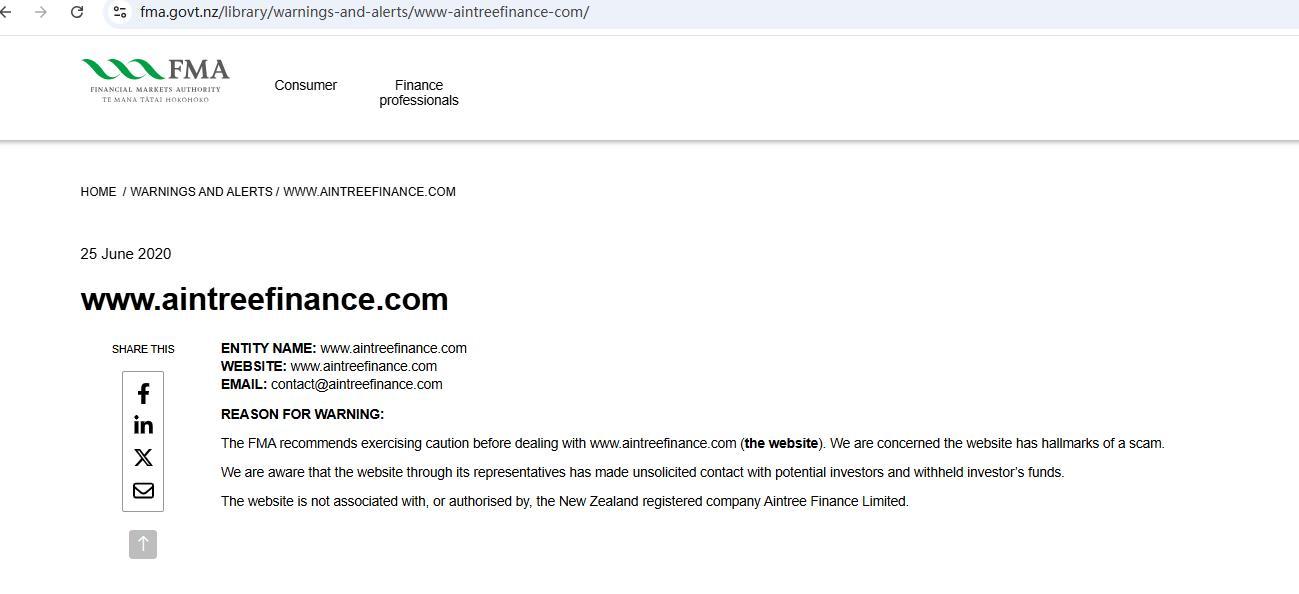 2020 年 6 月 25 日 www.aintreefinance.com 分享此实体 名称:www.aintreefinance.com 网站:www.aintreefinance.com 电子邮件:contact@aintreefinance.com 警告原因:金融市场管理局建议在与 www.aintreefinance.com(该网站)打交道前务必谨慎。我们担心该网站具有诈骗的迹象。我们知道该网站通过其代表与潜在投资者进行了未经请求的联系并扣留了投资者的资金。该网站与新西兰注册公司没有关联,也未获得其授权 Aintree 金融有限公司。