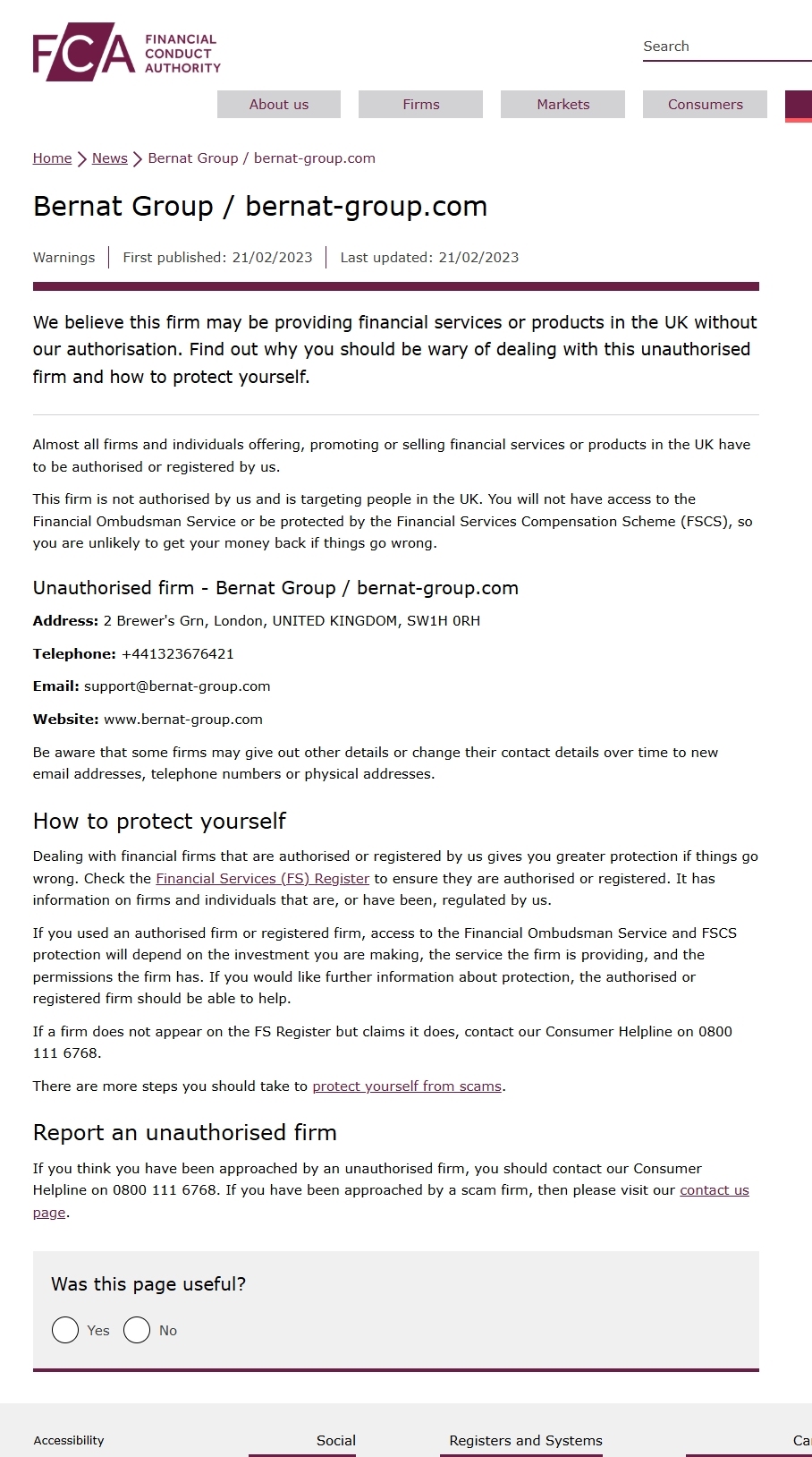 FCA未经授权公司警告名单 Bernat集团/bernat-group.com.