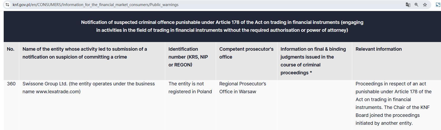 Swissone Group Ltd. (该实体以商业名称 www. LexaTrade .com) 该实体未在波兰华沙地区检察官办公室注册,该诉讼针对的是《金融工具交易法》第 178 条规定的应受惩处的行为。knf 董事会主席加入了另一个实体发起的诉讼。