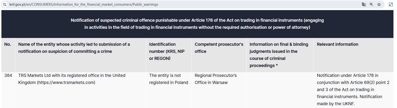 TRS Marketsltd 的注册办事处设在英国(https://www.trsmarkets.com),该实体未在波兰华沙地区检察官办公室注册,根据《金融工具交易法》第 178 条以及第 69(2) 点 2 和 3 的规定发出通知。由 uknf 发出的通知。