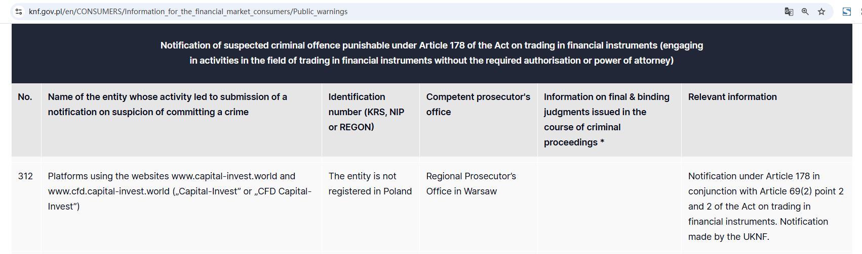 使用网站 www.capital-invest.world 和 www.cfd.capital-invest.world 的平台(“Capital-Invest” 或 “CFD Capital-Invest”)该实体未在波兰华沙地区检察院注册根据《金融工具交易法》第 178 条结合第 69(2) 点 2 和 2 的规定进行通知。由 UKNF 发出的通知。