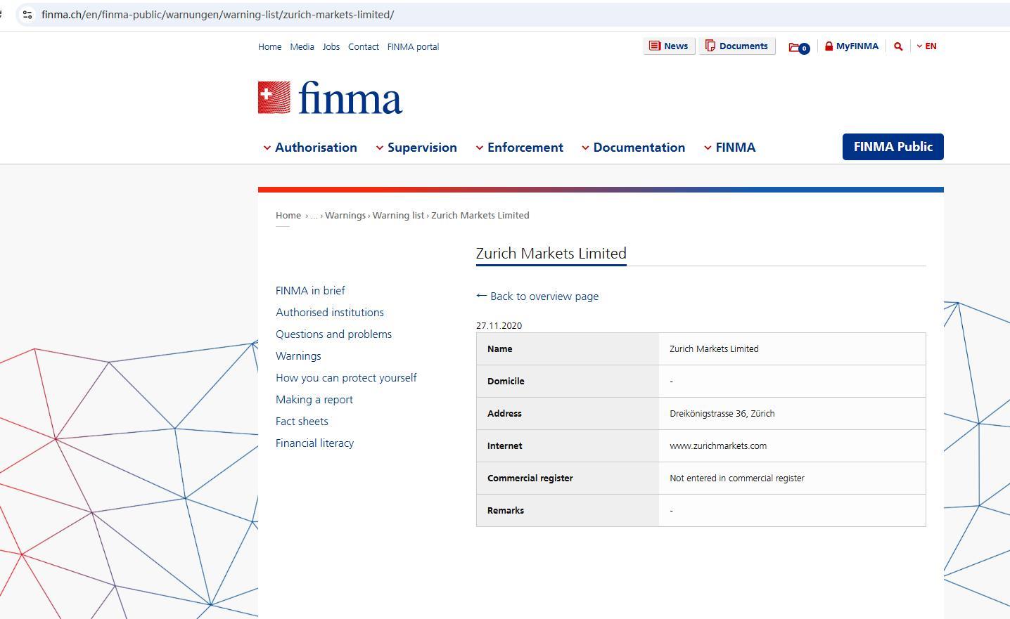 未经授权的公司和个人警告名单 苏黎世市场有限公司.