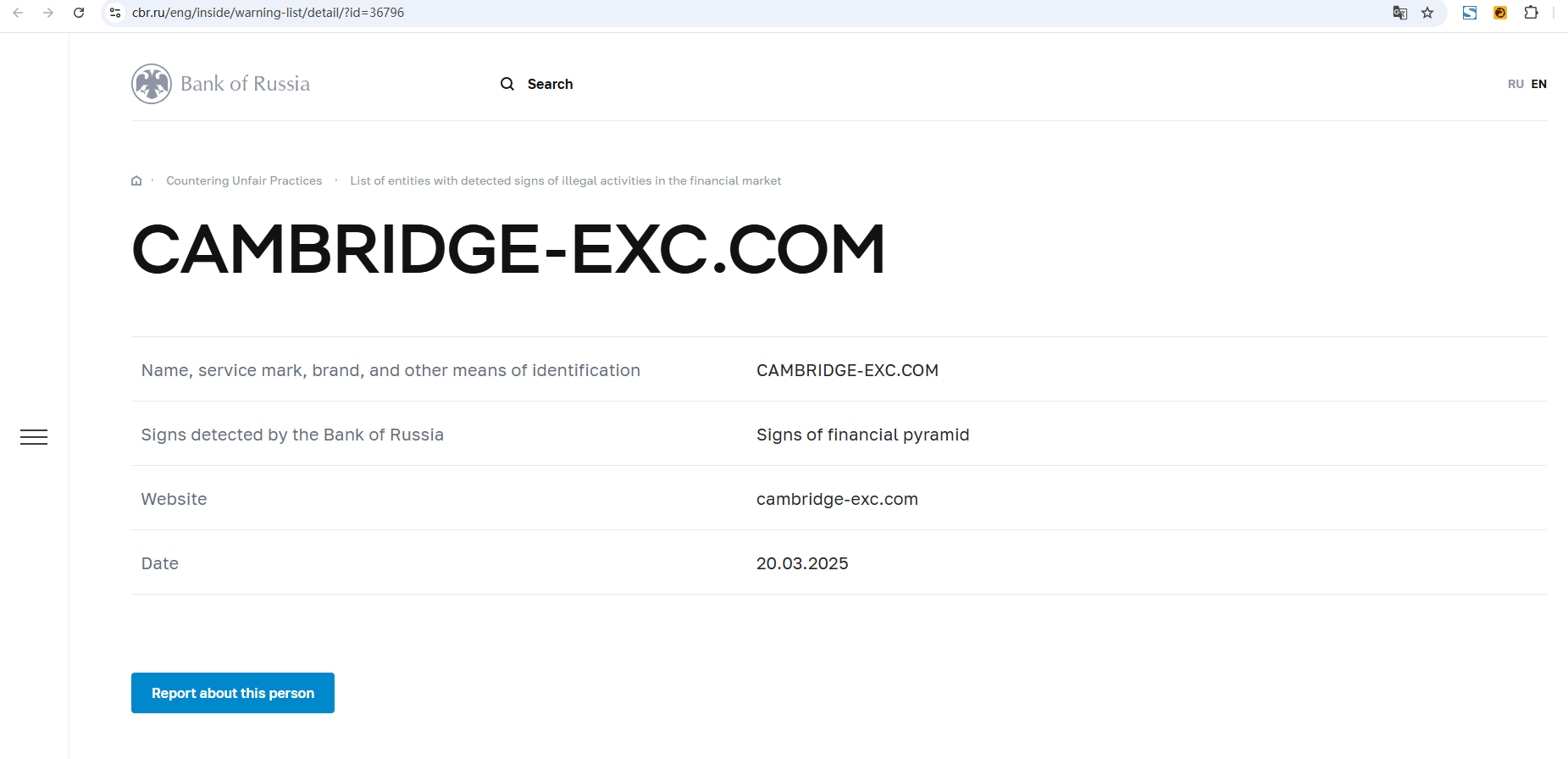 名称、服务标记、品牌和其他识别方式 CAMBRIDGE-EXC.COM 俄罗斯银行检测到的标志 金融金字塔标志 网站 cambridge-exc.com 日期 20.03.2025.