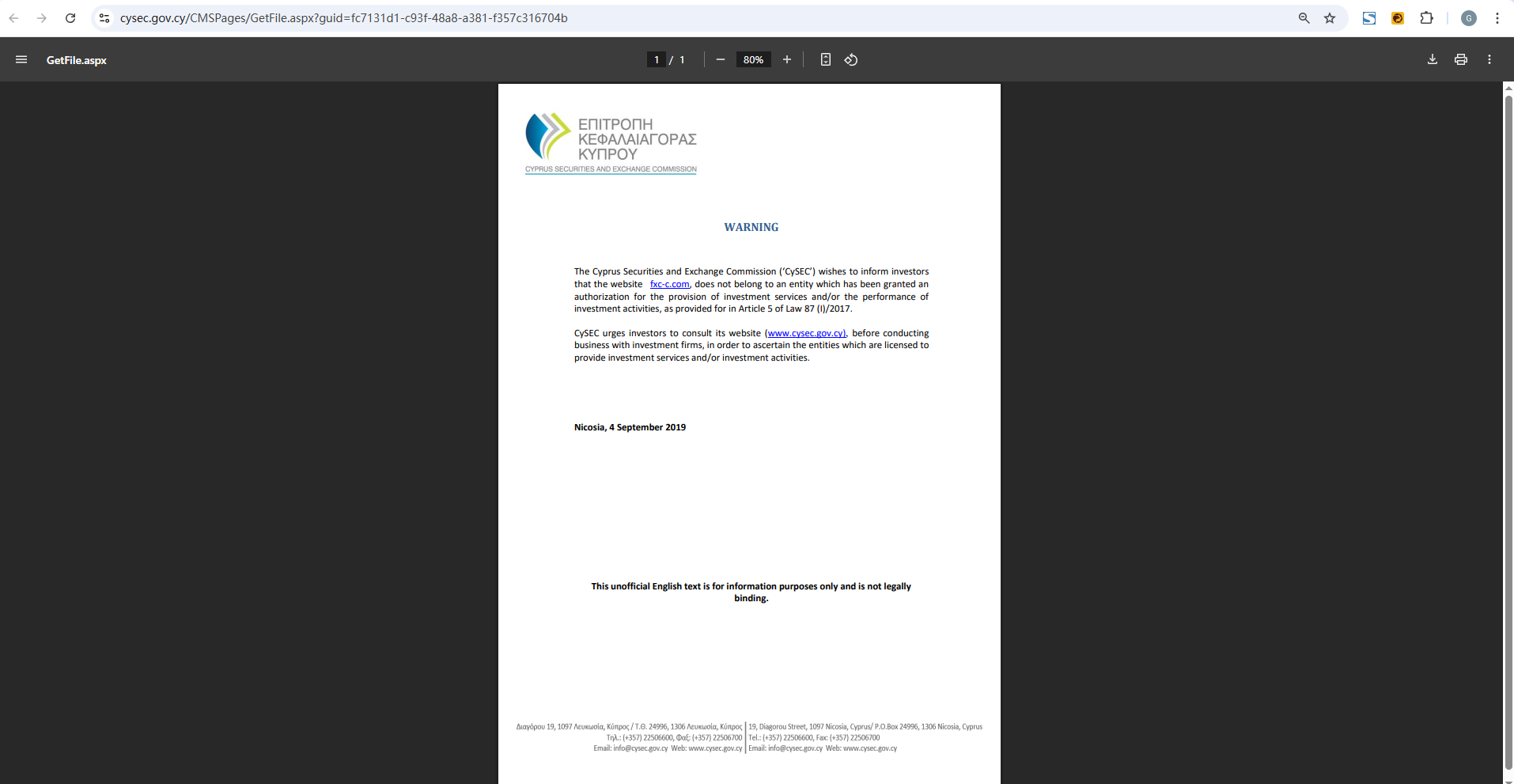 警告:塞浦路斯证券交易委员会(简称“CySEC”)谨此告知投资者,网站 fxc-c.com 不属于任何获得第 87 (I)/2017 号法律第 5 条授权提供投资服务和/或开展投资活动的实体。CySEC 敦促投资者在与投资公司开展业务之前,访问其网站 (www.cysec.gov.cy),以确定哪些实体获得提供投资服务和/或投资活动的许可。尼科西亚,2019 年 9 月 4 日。本非官方英文文本仅供参考,不具有法律约束力。.