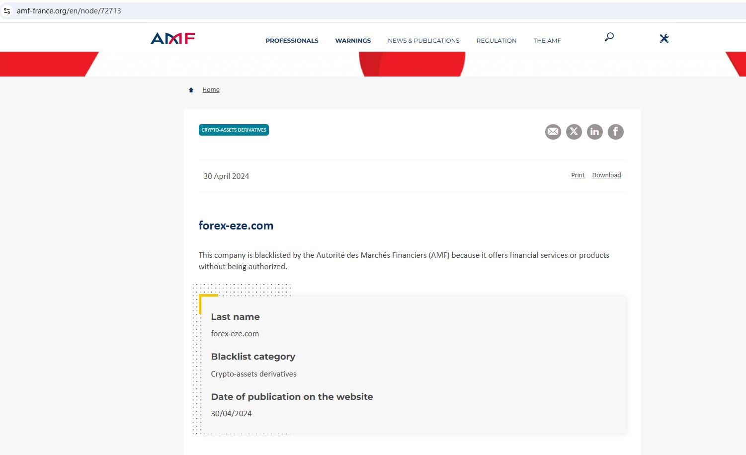 forex-eze.com 该公司已被法国金融市场管理局 (AMF) 列入黑名单,原因是其未经授权提供金融服务或产品。姓氏 forex-eze.com 黑名单类别:加密资产衍生品 网站发布日期:2024年4月30日